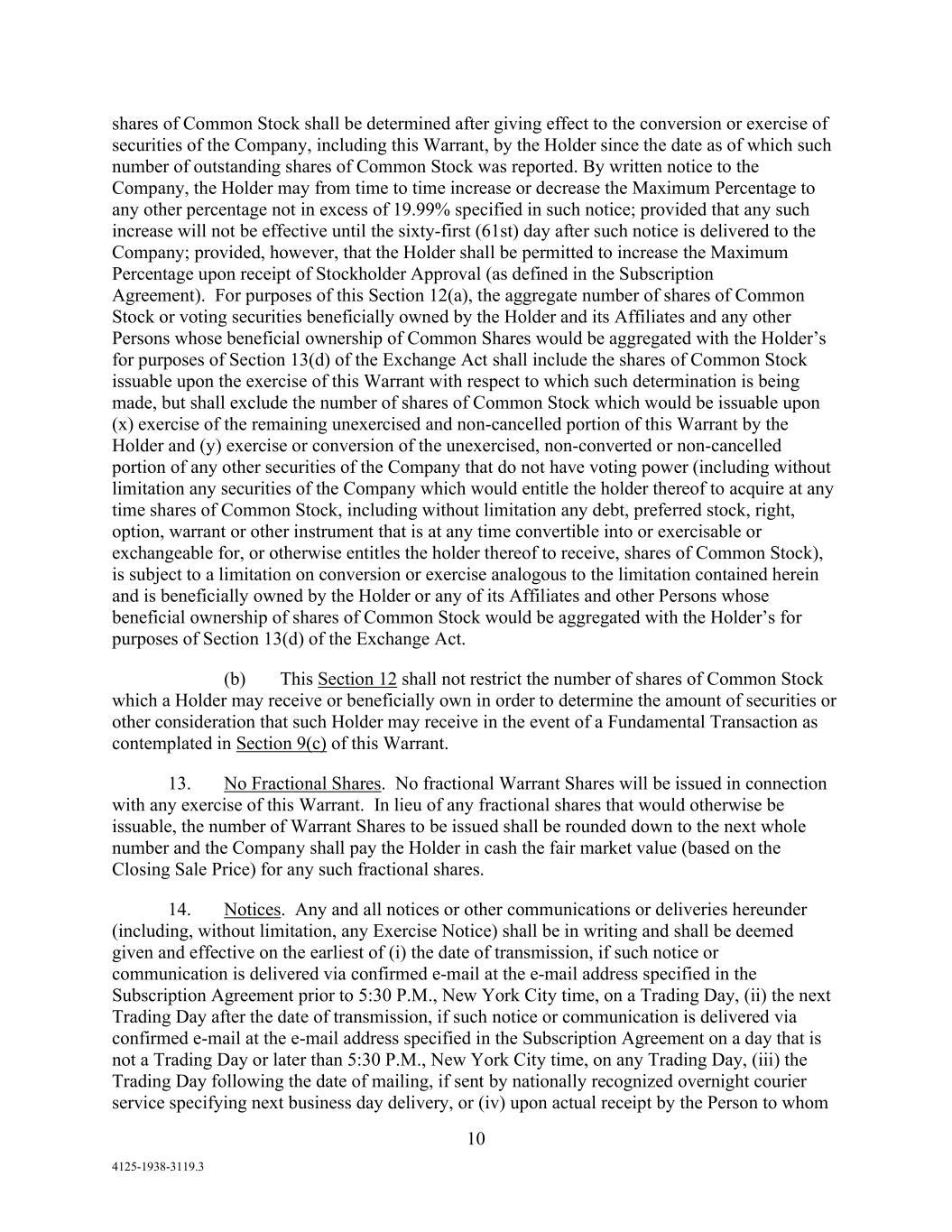 10 4125-1938-3119.3 shares of Common Stock shall be determined after giving effect to the conversion or exercise of securities of the Company, including this Warrant, by the Holder since the date as of which such number of outstanding shares of Common Stock was reported. By written notice to the Company, the Holder may from time to time increase or decrease the Maximum Percentage to any other percentage not in excess of 19.99% specified in such notice; provided that any such increase will not be effective until the sixty-first (61st) day after such notice is delivered to the Company; provided, however, that the Holder shall be permitted to increase the Maximum Percentage upon receipt of Stockholder Approval (as defined in the Subscription Agreement). For purposes of this Section 12(a), the aggregate number of shares of Common Stock or voting securities beneficially owned by the Holder and its Affiliates and any other Persons whose beneficial ownership of Common Shares would be aggregated with the Holder’s for purposes of Section 13(d) of the Exchange Act shall include the shares of Common Stock issuable upon the exercise of this Warrant with respect to which such determination is being made, but shall exclude the number of shares of Common Stock which would be issuable upon (x) exercise of the remaining unexercised and non-cancelled portion of this Warrant by the Holder and (y) exercise or conversion of the unexercised, non-converted or non-cancelled portion of any other securities of the Company that do not have voting power (including without limitation any securities of the Company which would entitle the holder thereof to acquire at any time shares of Common Stock, including without limitation any debt, preferred stock, right, option, warrant or other instrument that is at any time convertible into or exercisable or exchangeable for, or otherwise entitles the holder thereof to receive, shares of Common Stock), is subject to a limitation on conversion or exercise analogous to the limitation contained herein and is beneficially owned by the Holder or any of its Affiliates and other Persons whose beneficial ownership of shares of Common Stock would be aggregated with the Holder’s for purposes of Section 13(d) of the Exchange Act. (b) This Section 12 shall not restrict the number of shares of Common Stock which a Holder may receive or beneficially own in order to determine the amount of securities or other consideration that such Holder may receive in the event of a Fundamental Transaction as contemplated in Section 9(c) of this Warrant. 13. No Fractional Shares. No fractional Warrant Shares will be issued in connection with any exercise of this Warrant. In lieu of any fractional shares that would otherwise be issuable, the number of Warrant Shares to be issued shall be rounded down to the next whole number and the Company shall pay the Holder in cash the fair market value (based on the Closing Sale Price) for any such fractional shares. 14. Notices. Any and all notices or other communications or deliveries hereunder (including, without limitation, any Exercise Notice) shall be in writing and shall be deemed given and effective on the earliest of (i) the date of transmission, if such notice or communication is delivered via confirmed e-mail at the e-mail address specified in the Subscription Agreement prior to 5:30 P.M., New York City time, on a Trading Day, (ii) the next Trading Day after the date of transmission, if such notice or communication is delivered via confirmed e-mail at the e-mail address specified in the Subscription Agreement on a day that is not a Trading Day or later than 5:30 P.M., New York City time, on any Trading Day, (iii) the Trading Day following the date of mailing, if sent by nationally recognized overnight courier service specifying next business day delivery, or (iv) upon actual receipt by the Person to whom
