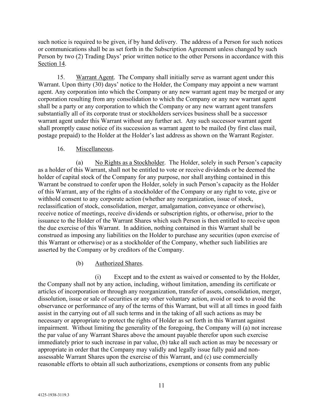11 4125-1938-3119.3 such notice is required to be given, if by hand delivery. The address of a Person for such notices or communications shall be as set forth in the Subscription Agreement unless changed by such Person by two (2) Trading Days’ prior written notice to the other Persons in accordance with this Section 14. 15. Warrant Agent. The Company shall initially serve as warrant agent under this Warrant. Upon thirty (30) days’ notice to the Holder, the Company may appoint a new warrant agent. Any corporation into which the Company or any new warrant agent may be merged or any corporation resulting from any consolidation to which the Company or any new warrant agent shall be a party or any corporation to which the Company or any new warrant agent transfers substantially all of its corporate trust or stockholders services business shall be a successor warrant agent under this Warrant without any further act. Any such successor warrant agent shall promptly cause notice of its succession as warrant agent to be mailed (by first class mail, postage prepaid) to the Holder at the Holder’s last address as shown on the Warrant Register. 16. Miscellaneous. (a) No Rights as a Stockholder. The Holder, solely in such Person’s capacity as a holder of this Warrant, shall not be entitled to vote or receive dividends or be deemed the holder of capital stock of the Company for any purpose, nor shall anything contained in this Warrant be construed to confer upon the Holder, solely in such Person’s capacity as the Holder of this Warrant, any of the rights of a stockholder of the Company or any right to vote, give or withhold consent to any corporate action (whether any reorganization, issue of stock, reclassification of stock, consolidation, merger, amalgamation, conveyance or otherwise), receive notice of meetings, receive dividends or subscription rights, or otherwise, prior to the issuance to the Holder of the Warrant Shares which such Person is then entitled to receive upon the due exercise of this Warrant. In addition, nothing contained in this Warrant shall be construed as imposing any liabilities on the Holder to purchase any securities (upon exercise of this Warrant or otherwise) or as a stockholder of the Company, whether such liabilities are asserted by the Company or by creditors of the Company. (b) Authorized Shares. (i) Except and to the extent as waived or consented to by the Holder, the Company shall not by any action, including, without limitation, amending its certificate or articles of incorporation or through any reorganization, transfer of assets, consolidation, merger, dissolution, issue or sale of securities or any other voluntary action, avoid or seek to avoid the observance or performance of any of the terms of this Warrant, but will at all times in good faith assist in the carrying out of all such terms and in the taking of all such actions as may be necessary or appropriate to protect the rights of Holder as set forth in this Warrant against impairment. Without limiting the generality of the foregoing, the Company will (a) not increase the par value of any Warrant Shares above the amount payable therefor upon such exercise immediately prior to such increase in par value, (b) take all such action as may be necessary or appropriate in order that the Company may validly and legally issue fully paid and non- assessable Warrant Shares upon the exercise of this Warrant, and (c) use commercially reasonable efforts to obtain all such authorizations, exemptions or consents from any public