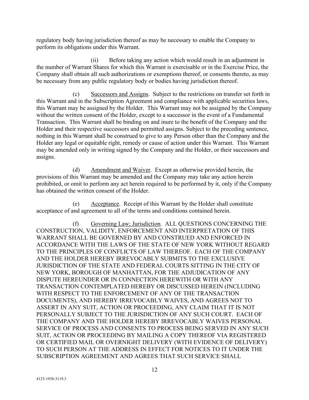 12 4125-1938-3119.3 regulatory body having jurisdiction thereof as may be necessary to enable the Company to perform its obligations under this Warrant. (ii) Before taking any action which would result in an adjustment in the number of Warrant Shares for which this Warrant is exercisable or in the Exercise Price, the Company shall obtain all such authorizations or exemptions thereof, or consents thereto, as may be necessary from any public regulatory body or bodies having jurisdiction thereof. (c) Successors and Assigns. Subject to the restrictions on transfer set forth in this Warrant and in the Subscription Agreement and compliance with applicable securities laws, this Warrant may be assigned by the Holder. This Warrant may not be assigned by the Company without the written consent of the Holder, except to a successor in the event of a Fundamental Transaction. This Warrant shall be binding on and inure to the benefit of the Company and the Holder and their respective successors and permitted assigns. Subject to the preceding sentence, nothing in this Warrant shall be construed to give to any Person other than the Company and the Holder any legal or equitable right, remedy or cause of action under this Warrant. This Warrant may be amended only in writing signed by the Company and the Holder, or their successors and assigns. (d) Amendment and Waiver. Except as otherwise provided herein, the provisions of this Warrant may be amended and the Company may take any action herein prohibited, or omit to perform any act herein required to be performed by it, only if the Company has obtained the written consent of the Holder. (e) Acceptance. Receipt of this Warrant by the Holder shall constitute acceptance of and agreement to all of the terms and conditions contained herein. (f) Governing Law; Jurisdiction. ALL QUESTIONS CONCERNING THE CONSTRUCTION, VALIDITY, ENFORCEMENT AND INTERPRETATION OF THIS WARRANT SHALL BE GOVERNED BY AND CONSTRUED AND ENFORCED IN ACCORDANCE WITH THE LAWS OF THE STATE OF NEW YORK WITHOUT REGARD TO THE PRINCIPLES OF CONFLICTS OF LAW THEREOF. EACH OF THE COMPANY AND THE HOLDER HEREBY IRREVOCABLY SUBMITS TO THE EXCLUSIVE JURISDICTION OF THE STATE AND FEDERAL COURTS SITTING IN THE CITY OF NEW YORK, BOROUGH OF MANHATTAN, FOR THE ADJUDICATION OF ANY DISPUTE HEREUNDER OR IN CONNECTION HEREWITH OR WITH ANY TRANSACTION CONTEMPLATED HEREBY OR DISCUSSED HEREIN (INCLUDING WITH RESPECT TO THE ENFORCEMENT OF ANY OF THE TRANSACTION DOCUMENTS), AND HEREBY IRREVOCABLY WAIVES, AND AGREES NOT TO ASSERT IN ANY SUIT, ACTION OR PROCEEDING, ANY CLAIM THAT IT IS NOT PERSONALLY SUBJECT TO THE JURISDICTION OF ANY SUCH COURT. EACH OF THE COMPANY AND THE HOLDER HEREBY IRREVOCABLY WAIVES PERSONAL SERVICE OF PROCESS AND CONSENTS TO PROCESS BEING SERVED IN ANY SUCH SUIT, ACTION OR PROCEEDING BY MAILING A COPY THEREOF VIA REGISTERED OR CERTIFIED MAIL OR OVERNIGHT DELIVERY (WITH EVIDENCE OF DELIVERY) TO SUCH PERSON AT THE ADDRESS IN EFFECT FOR NOTICES TO IT UNDER THE SUBSCRIPTION AGREEMENT AND AGREES THAT SUCH SERVICE SHALL