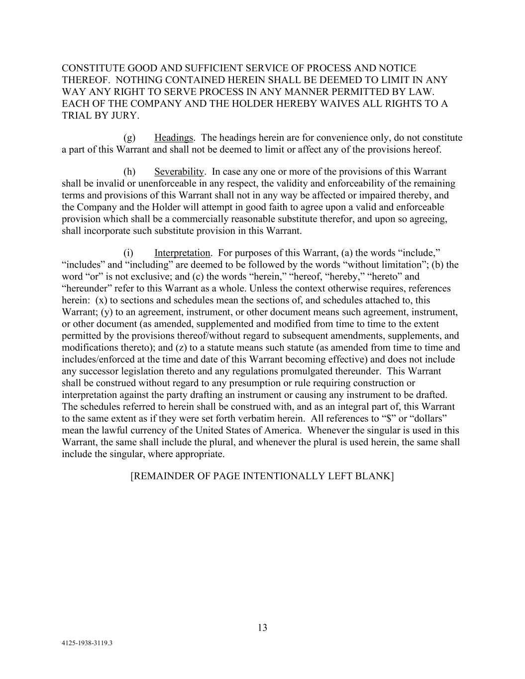 13 4125-1938-3119.3 CONSTITUTE GOOD AND SUFFICIENT SERVICE OF PROCESS AND NOTICE THEREOF. NOTHING CONTAINED HEREIN SHALL BE DEEMED TO LIMIT IN ANY WAY ANY RIGHT TO SERVE PROCESS IN ANY MANNER PERMITTED BY LAW. EACH OF THE COMPANY AND THE HOLDER HEREBY WAIVES ALL RIGHTS TO A TRIAL BY JURY. (g) Headings. The headings herein are for convenience only, do not constitute a part of this Warrant and shall not be deemed to limit or affect any of the provisions hereof. (h) Severability. In case any one or more of the provisions of this Warrant shall be invalid or unenforceable in any respect, the validity and enforceability of the remaining terms and provisions of this Warrant shall not in any way be affected or impaired thereby, and the Company and the Holder will attempt in good faith to agree upon a valid and enforceable provision which shall be a commercially reasonable substitute therefor, and upon so agreeing, shall incorporate such substitute provision in this Warrant. (i) Interpretation. For purposes of this Warrant, (a) the words “include,” “includes” and “including” are deemed to be followed by the words “without limitation”; (b) the word “or” is not exclusive; and (c) the words “herein,” “hereof, “hereby,” “hereto” and “hereunder” refer to this Warrant as a whole. Unless the context otherwise requires, references herein: (x) to sections and schedules mean the sections of, and schedules attached to, this Warrant; (y) to an agreement, instrument, or other document means such agreement, instrument, or other document (as amended, supplemented and modified from time to time to the extent permitted by the provisions thereof/without regard to subsequent amendments, supplements, and modifications thereto); and (z) to a statute means such statute (as amended from time to time and includes/enforced at the time and date of this Warrant becoming effective) and does not include any successor legislation thereto and any regulations promulgated thereunder. This Warrant shall be construed without regard to any presumption or rule requiring construction or interpretation against the party drafting an instrument or causing any instrument to be drafted. The schedules referred to herein shall be construed with, and as an integral part of, this Warrant to the same extent as if they were set forth verbatim herein. All references to “$” or “dollars” mean the lawful currency of the United States of America. Whenever the singular is used in this Warrant, the same shall include the plural, and whenever the plural is used herein, the same shall include the singular, where appropriate. [REMAINDER OF PAGE INTENTIONALLY LEFT BLANK]