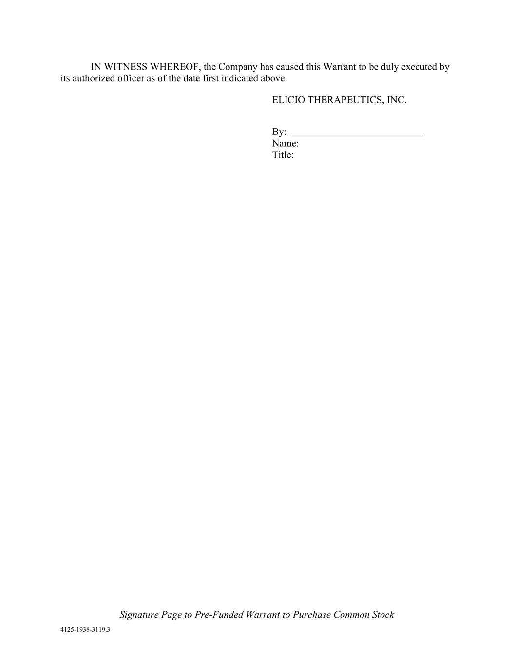Signature Page to Pre-Funded Warrant to Purchase Common Stock 4125-1938-3119.3 IN WITNESS WHEREOF, the Company has caused this Warrant to be duly executed by its authorized officer as of the date first indicated above. ELICIO THERAPEUTICS, INC. By: Name: Title: