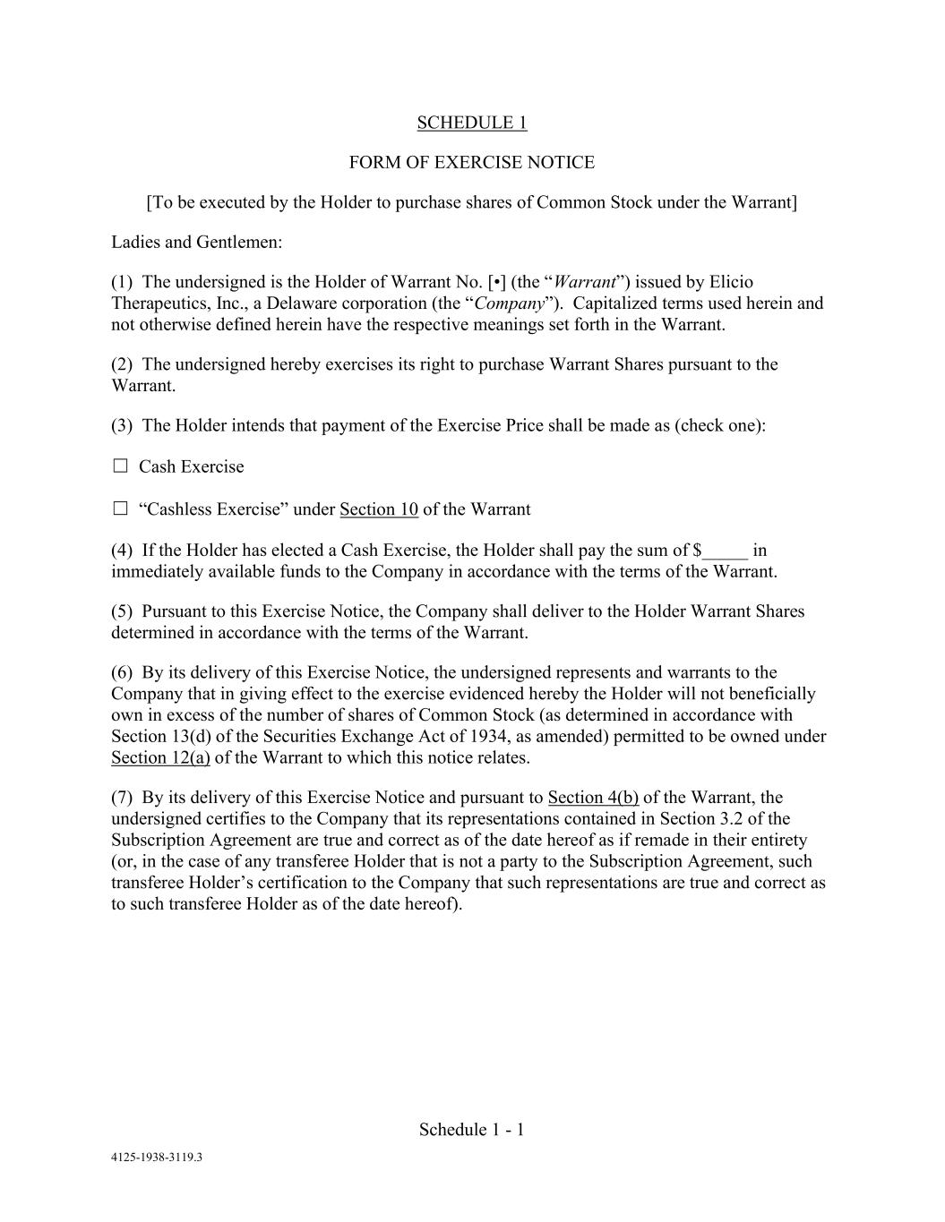 Schedule 1 - 1 4125-1938-3119.3 SCHEDULE 1 FORM OF EXERCISE NOTICE [To be executed by the Holder to purchase shares of Common Stock under the Warrant] Ladies and Gentlemen: (1) The undersigned is the Holder of Warrant No. [•] (the “Warrant”) issued by Elicio Therapeutics, Inc., a Delaware corporation (the “Company”). Capitalized terms used herein and not otherwise defined herein have the respective meanings set forth in the Warrant. (2) The undersigned hereby exercises its right to purchase Warrant Shares pursuant to the Warrant. (3) The Holder intends that payment of the Exercise Price shall be made as (check one): ☐ Cash Exercise ☐ “Cashless Exercise” under Section 10 of the Warrant (4) If the Holder has elected a Cash Exercise, the Holder shall pay the sum of $_____ in immediately available funds to the Company in accordance with the terms of the Warrant. (5) Pursuant to this Exercise Notice, the Company shall deliver to the Holder Warrant Shares determined in accordance with the terms of the Warrant. (6) By its delivery of this Exercise Notice, the undersigned represents and warrants to the Company that in giving effect to the exercise evidenced hereby the Holder will not beneficially own in excess of the number of shares of Common Stock (as determined in accordance with Section 13(d) of the Securities Exchange Act of 1934, as amended) permitted to be owned under Section 12(a) of the Warrant to which this notice relates. (7) By its delivery of this Exercise Notice and pursuant to Section 4(b) of the Warrant, the undersigned certifies to the Company that its representations contained in Section 3.2 of the Subscription Agreement are true and correct as of the date hereof as if remade in their entirety (or, in the case of any transferee Holder that is not a party to the Subscription Agreement, such transferee Holder’s certification to the Company that such representations are true and correct as to such transferee Holder as of the date hereof).
