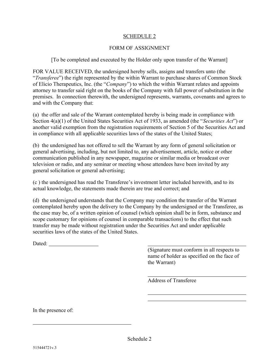 Schedule 2 SCHEDULE 2 FORM OF ASSIGNMENT [To be completed and executed by the Holder only upon transfer of the Warrant] FOR VALUE RECEIVED, the undersigned hereby sells, assigns and transfers unto (the “Transferee”) the right represented by the within Warrant to purchase shares of Common Stock of Elicio Therapeutics, Inc. (the “Company”) to which the within Warrant relates and appoints attorney to transfer said right on the books of the Company with full power of substitution in the premises. In connection therewith, the undersigned represents, warrants, covenants and agrees to and with the Company that: (a) the offer and sale of the Warrant contemplated hereby is being made in compliance with Section 4(a)(1) of the United States Securities Act of 1933, as amended (the “Securities Act”) or another valid exemption from the registration requirements of Section 5 of the Securities Act and in compliance with all applicable securities laws of the states of the United States; (b) the undersigned has not offered to sell the Warrant by any form of general solicitation or general advertising, including, but not limited to, any advertisement, article, notice or other communication published in any newspaper, magazine or similar media or broadcast over television or radio, and any seminar or meeting whose attendees have been invited by any general solicitation or general advertising; (c ) the undersigned has read the Transferee’s investment letter included herewith, and to its actual knowledge, the statements made therein are true and correct; and (d) the undersigned understands that the Company may condition the transfer of the Warrant contemplated hereby upon the delivery to the Company by the undersigned or the Transferee, as the case may be, of a written opinion of counsel (which opinion shall be in form, substance and scope customary for opinions of counsel in comparable transactions) to the effect that such transfer may be made without registration under the Securities Act and under applicable securities laws of the states of the United States. Dated: (Signature must conform in all respects to name of holder as specified on the face of the Warrant) Address of Transferee In the presence of: 515444721v.3