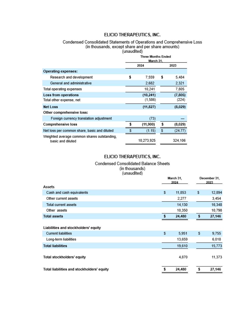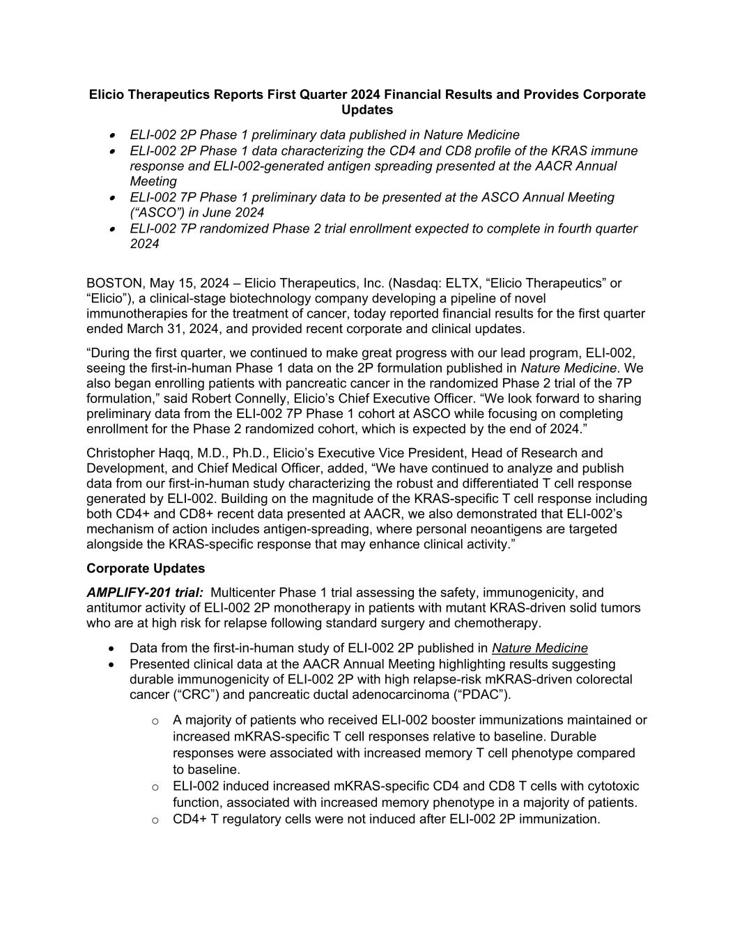 Elicio Therapeutics Reports First Quarter 2024 Financial Results and Provides Corporate Updates • ELI-002 2P Phase 1 preliminary data published in Nature Medicine • ELI-002 2P Phase 1 data characterizing the CD4 and CD8 profile of the KRAS immune response and ELI-002-generated antigen spreading presented at the AACR Annual Meeting • ELI-002 7P Phase 1 preliminary data to be presented at the ASCO Annual Meeting (“ASCO”) in June 2024 • ELI-002 7P randomized Phase 2 trial enrollment expected to complete in fourth quarter 2024 BOSTON, May 15, 2024 – Elicio Therapeutics, Inc. (Nasdaq: ELTX, “Elicio Therapeutics” or “Elicio”), a clinical-stage biotechnology company developing a pipeline of novel immunotherapies for the treatment of cancer, today reported financial results for the first quarter ended March 31, 2024, and provided recent corporate and clinical updates. “During the first quarter, we continued to make great progress with our lead program, ELI-002, seeing the first-in-human Phase 1 data on the 2P formulation published in Nature Medicine. We also began enrolling patients with pancreatic cancer in the randomized Phase 2 trial of the 7P formulation,” said Robert Connelly, Elicio’s Chief Executive Officer. “We look forward to sharing preliminary data from the ELI-002 7P Phase 1 cohort at ASCO while focusing on completing enrollment for the Phase 2 randomized cohort, which is expected by the end of 2024.” Christopher Haqq, M.D., Ph.D., Elicio’s Executive Vice President, Head of Research and Development, and Chief Medical Officer, added, “We have continued to analyze and publish data from our first-in-human study characterizing the robust and differentiated T cell response generated by ELI-002. Building on the magnitude of the KRAS-specific T cell response including both CD4+ and CD8+ recent data presented at AACR, we also demonstrated that ELI-002’s mechanism of action includes antigen-spreading, where personal neoantigens are targeted alongside the KRAS-specific response that may enhance clinical activity.” Corporate Updates AMPLIFY-201 trial: Multicenter Phase 1 trial assessing the safety, immunogenicity, and antitumor activity of ELI-002 2P monotherapy in patients with mutant KRAS-driven solid tumors who are at high risk for relapse following standard surgery and chemotherapy. • Data from the first-in-human study of ELI-002 2P published in Nature Medicine • Presented clinical data at the AACR Annual Meeting highlighting results suggesting durable immunogenicity of ELI-002 2P with high relapse-risk mKRAS-driven colorectal cancer (“CRC”) and pancreatic ductal adenocarcinoma (“PDAC”). o A majority of patients who received ELI-002 booster immunizations maintained or increased mKRAS-specific T cell responses relative to baseline. Durable responses were associated with increased memory T cell phenotype compared to baseline. o ELI-002 induced increased mKRAS-specific CD4 and CD8 T cells with cytotoxic function, associated with increased memory phenotype in a majority of patients. o CD4+ T regulatory cells were not induced after ELI-002 2P immunization.