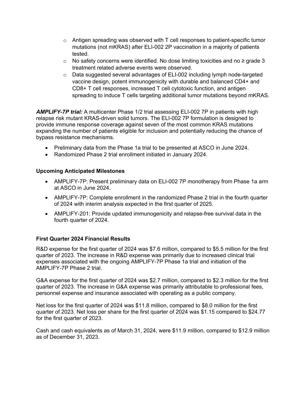 o Antigen spreading was observed with T cell responses to patient-specific tumor mutations (not mKRAS) after ELI-002 2P vaccination in a majority of patients tested. o No safety concerns were identified. No dose limiting toxicities and no ≥ grade 3 treatment related adverse events were observed. o Data suggested several advantages of ELI-002 including lymph node-targeted vaccine design, potent immunogenicity with durable and balanced CD4+ and CD8+ T cell responses, increased T cell cytotoxic function, and antigen spreading to induce T cells targeting additional tumor mutations beyond mKRAS. AMPLIFY-7P trial: A multicenter Phase 1/2 trial assessing ELI-002 7P in patients with high relapse risk mutant KRAS-driven solid tumors. The ELI-002 7P formulation is designed to provide immune response coverage against seven of the most common KRAS mutations expanding the number of patients eligible for inclusion and potentially reducing the chance of bypass resistance mechanisms. • Preliminary data from the Phase 1a trial to be presented at ASCO in June 2024. • Randomized Phase 2 trial enrollment initiated in January 2024. Upcoming Anticipated Milestones • AMPLIFY-7P: Present preliminary data on ELI-002 7P monotherapy from Phase 1a arm at ASCO in June 2024. • AMPLIFY-7P: Complete enrollment in the randomized Phase 2 trial in the fourth quarter of 2024 with interim analysis expected in the first quarter of 2025. • AMPLIFY-201: Provide updated immunogenicity and relapse-free survival data in the fourth quarter of 2024. First Quarter 2024 Financial Results R&D expense for the first quarter of 2024 was $7.6 million, compared to $5.5 million for the first quarter of 2023. The increase in R&D expense was primarily due to increased clinical trial expenses associated with the ongoing AMPLIFY-7P Phase 1a trial and initiation of the AMPLIFY-7P Phase 2 trial. G&A expense for the first quarter of 2024 was $2.7 million, compared to $2.3 million for the first quarter of 2023. The increase in G&A expense was primarily attributable to professional fees, personnel expense and insurance associated with operating as a public company. Net loss for the first quarter of 2024 was $11.8 million, compared to $8.0 million for the first quarter of 2023. Net loss per share for the first quarter of 2024 was $1.15 compared to $24.77 for the first quarter of 2023. Cash and cash equivalents as of March 31, 2024, were $11.9 million, compared to $12.9 million as of December 31, 2023.