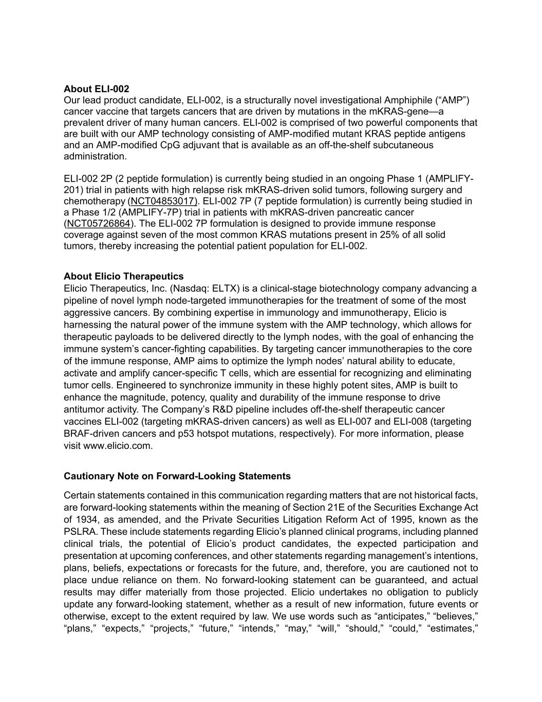About ELI-002 Our lead product candidate, ELI-002, is a structurally novel investigational Amphiphile (“AMP”) cancer vaccine that targets cancers that are driven by mutations in the mKRAS-gene—a prevalent driver of many human cancers. ELI-002 is comprised of two powerful components that are built with our AMP technology consisting of AMP-modified mutant KRAS peptide antigens and an AMP-modified CpG adjuvant that is available as an off-the-shelf subcutaneous administration. ELI-002 2P (2 peptide formulation) is currently being studied in an ongoing Phase 1 (AMPLIFY- 201) trial in patients with high relapse risk mKRAS-driven solid tumors, following surgery and chemotherapy (NCT04853017). ELI-002 7P (7 peptide formulation) is currently being studied in a Phase 1/2 (AMPLIFY-7P) trial in patients with mKRAS-driven pancreatic cancer (NCT05726864). The ELI-002 7P formulation is designed to provide immune response coverage against seven of the most common KRAS mutations present in 25% of all solid tumors, thereby increasing the potential patient population for ELI-002. About Elicio Therapeutics Elicio Therapeutics, Inc. (Nasdaq: ELTX) is a clinical-stage biotechnology company advancing a pipeline of novel lymph node-targeted immunotherapies for the treatment of some of the most aggressive cancers. By combining expertise in immunology and immunotherapy, Elicio is harnessing the natural power of the immune system with the AMP technology, which allows for therapeutic payloads to be delivered directly to the lymph nodes, with the goal of enhancing the immune system’s cancer-fighting capabilities. By targeting cancer immunotherapies to the core of the immune response, AMP aims to optimize the lymph nodes’ natural ability to educate, activate and amplify cancer-specific T cells, which are essential for recognizing and eliminating tumor cells. Engineered to synchronize immunity in these highly potent sites, AMP is built to enhance the magnitude, potency, quality and durability of the immune response to drive antitumor activity. The Company’s R&D pipeline includes off-the-shelf therapeutic cancer vaccines ELI-002 (targeting mKRAS-driven cancers) as well as ELI-007 and ELI-008 (targeting BRAF-driven cancers and p53 hotspot mutations, respectively). For more information, please visit www.elicio.com. Cautionary Note on Forward-Looking Statements Certain statements contained in this communication regarding matters that are not historical facts, are forward-looking statements within the meaning of Section 21E of the Securities Exchange Act of 1934, as amended, and the Private Securities Litigation Reform Act of 1995, known as the PSLRA. These include statements regarding Elicio’s planned clinical programs, including planned clinical trials, the potential of Elicio’s product candidates, the expected participation and presentation at upcoming conferences, and other statements regarding management’s intentions, plans, beliefs, expectations or forecasts for the future, and, therefore, you are cautioned not to place undue reliance on them. No forward-looking statement can be guaranteed, and actual results may differ materially from those projected. Elicio undertakes no obligation to publicly update any forward-looking statement, whether as a result of new information, future events or otherwise, except to the extent required by law. We use words such as “anticipates,” “believes,” “plans,” “expects,” “projects,” “future,” “intends,” “may,” “will,” “should,” “could,” “estimates,”