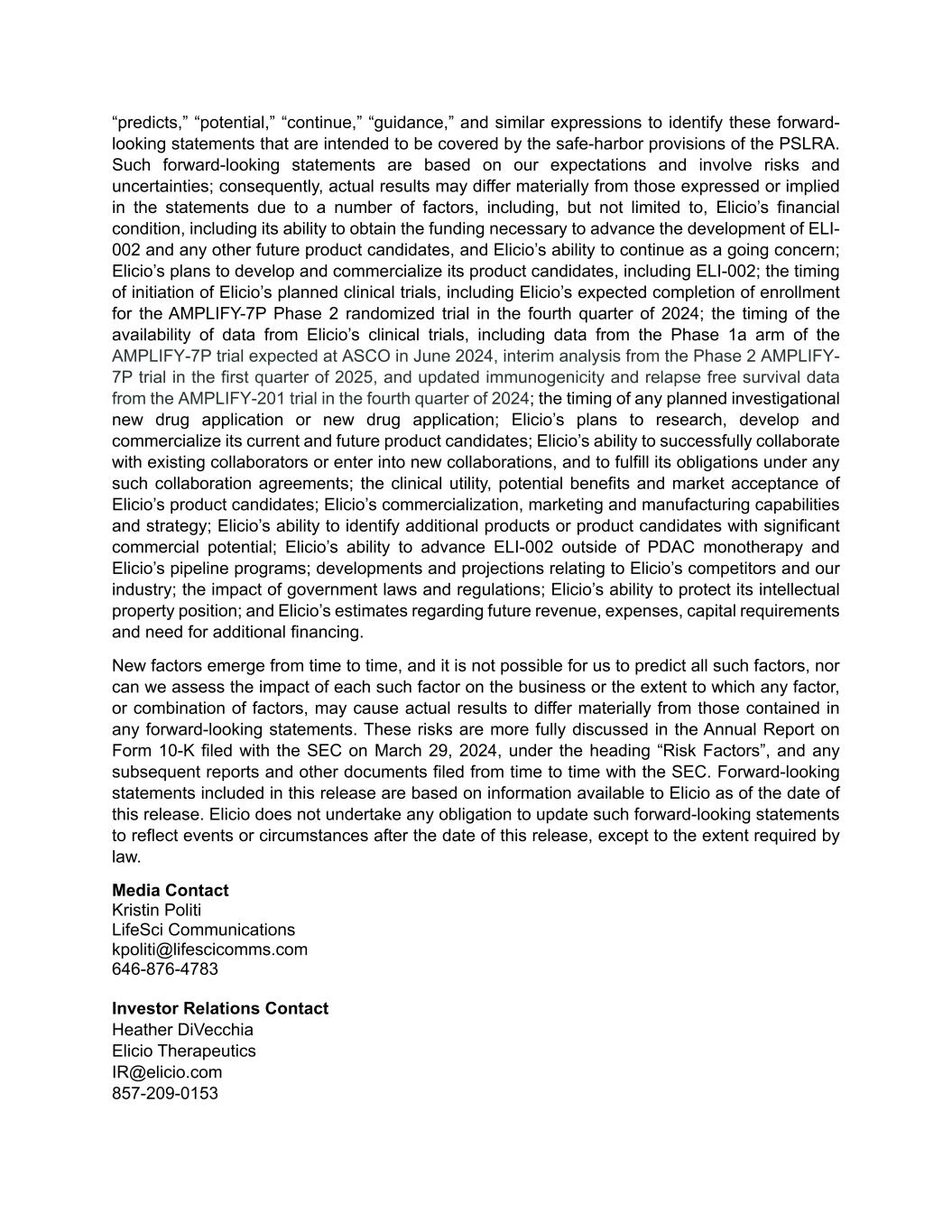 “predicts,” “potential,” “continue,” “guidance,” and similar expressions to identify these forward- looking statements that are intended to be covered by the safe-harbor provisions of the PSLRA. Such forward-looking statements are based on our expectations and involve risks and uncertainties; consequently, actual results may differ materially from those expressed or implied in the statements due to a number of factors, including, but not limited to, Elicio’s financial condition, including its ability to obtain the funding necessary to advance the development of ELI- 002 and any other future product candidates, and Elicio’s ability to continue as a going concern; Elicio’s plans to develop and commercialize its product candidates, including ELI-002; the timing of initiation of Elicio’s planned clinical trials, including Elicio’s expected completion of enrollment for the AMPLIFY-7P Phase 2 randomized trial in the fourth quarter of 2024; the timing of the availability of data from Elicio’s clinical trials, including data from the Phase 1a arm of the AMPLIFY-7P trial expected at ASCO in June 2024, interim analysis from the Phase 2 AMPLIFY- 7P trial in the first quarter of 2025, and updated immunogenicity and relapse free survival data from the AMPLIFY-201 trial in the fourth quarter of 2024; the timing of any planned investigational new drug application or new drug application; Elicio’s plans to research, develop and commercialize its current and future product candidates; Elicio’s ability to successfully collaborate with existing collaborators or enter into new collaborations, and to fulfill its obligations under any such collaboration agreements; the clinical utility, potential benefits and market acceptance of Elicio’s product candidates; Elicio’s commercialization, marketing and manufacturing capabilities and strategy; Elicio’s ability to identify additional products or product candidates with significant commercial potential; Elicio’s ability to advance ELI-002 outside of PDAC monotherapy and Elicio’s pipeline programs; developments and projections relating to Elicio’s competitors and our industry; the impact of government laws and regulations; Elicio’s ability to protect its intellectual property position; and Elicio’s estimates regarding future revenue, expenses, capital requirements and need for additional financing. New factors emerge from time to time, and it is not possible for us to predict all such factors, nor can we assess the impact of each such factor on the business or the extent to which any factor, or combination of factors, may cause actual results to differ materially from those contained in any forward-looking statements. These risks are more fully discussed in the Annual Report on Form 10-K filed with the SEC on March 29, 2024, under the heading “Risk Factors”, and any subsequent reports and other documents filed from time to time with the SEC. Forward-looking statements included in this release are based on information available to Elicio as of the date of this release. Elicio does not undertake any obligation to update such forward-looking statements to reflect events or circumstances after the date of this release, except to the extent required by law. Media Contact Kristin Politi LifeSci Communications kpoliti@lifescicomms.com 646-876-4783 Investor Relations Contact Heather DiVecchia Elicio Therapeutics IR@elicio.com 857-209-0153
