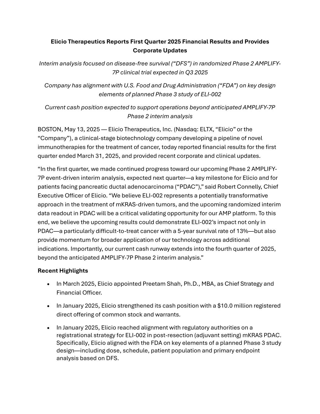 Elicio Therapeutics Reports First Quarter 2025 Financial Results and Provides Corporate Updates Interim analysis focused on disease-free survival (“DFS”) in randomized Phase 2 AMPLIFY- 7P clinical trial expected in Q3 2025 Company has alignment with U.S. Food and Drug Administration (“FDA”) on key design elements of planned Phase 3 study of ELI-002 Current cash position expected to support operations beyond anticipated AMPLIFY-7P Phase 2 interim analysis BOSTON, May 13, 2025 — Elicio Therapeutics, Inc. (Nasdaq: ELTX, “Elicio” or the “Company”), a clinical-stage biotechnology company developing a pipeline of novel immunotherapies for the treatment of cancer, today reported financial results for the first quarter ended March 31, 2025, and provided recent corporate and clinical updates. “In the first quarter, we made continued progress toward our upcoming Phase 2 AMPLIFY- 7P event-driven interim analysis, expected next quarter—a key milestone for Elicio and for patients facing pancreatic ductal adenocarcinoma (“PDAC”),” said Robert Connelly, Chief Executive Officer of Elicio. “We believe ELI-002 represents a potentially transformative approach in the treatment of mKRAS-driven tumors, and the upcoming randomized interim data readout in PDAC will be a critical validating opportunity for our AMP platform. To this end, we believe the upcoming results could demonstrate ELI-002’s impact not only in PDAC—a particularly difficult-to-treat cancer with a 5-year survival rate of 13%—but also provide momentum for broader application of our technology across additional indications. Importantly, our current cash runway extends into the fourth quarter of 2025, beyond the anticipated AMPLIFY-7P Phase 2 interim analysis.” Recent Highlights • In March 2025, Elicio appointed Preetam Shah, Ph.D., MBA, as Chief Strategy and Financial Officer. • In January 2025, Elicio strengthened its cash position with a $10.0 million registered direct offering of common stock and warrants. • In January 2025, Elicio reached alignment with regulatory authorities on a registrational strategy for ELI-002 in post-resection (adjuvant setting) mKRAS PDAC. Specifically, Elicio aligned with the FDA on key elements of a planned Phase 3 study design—including dose, schedule, patient population and primary endpoint analysis based on DFS.