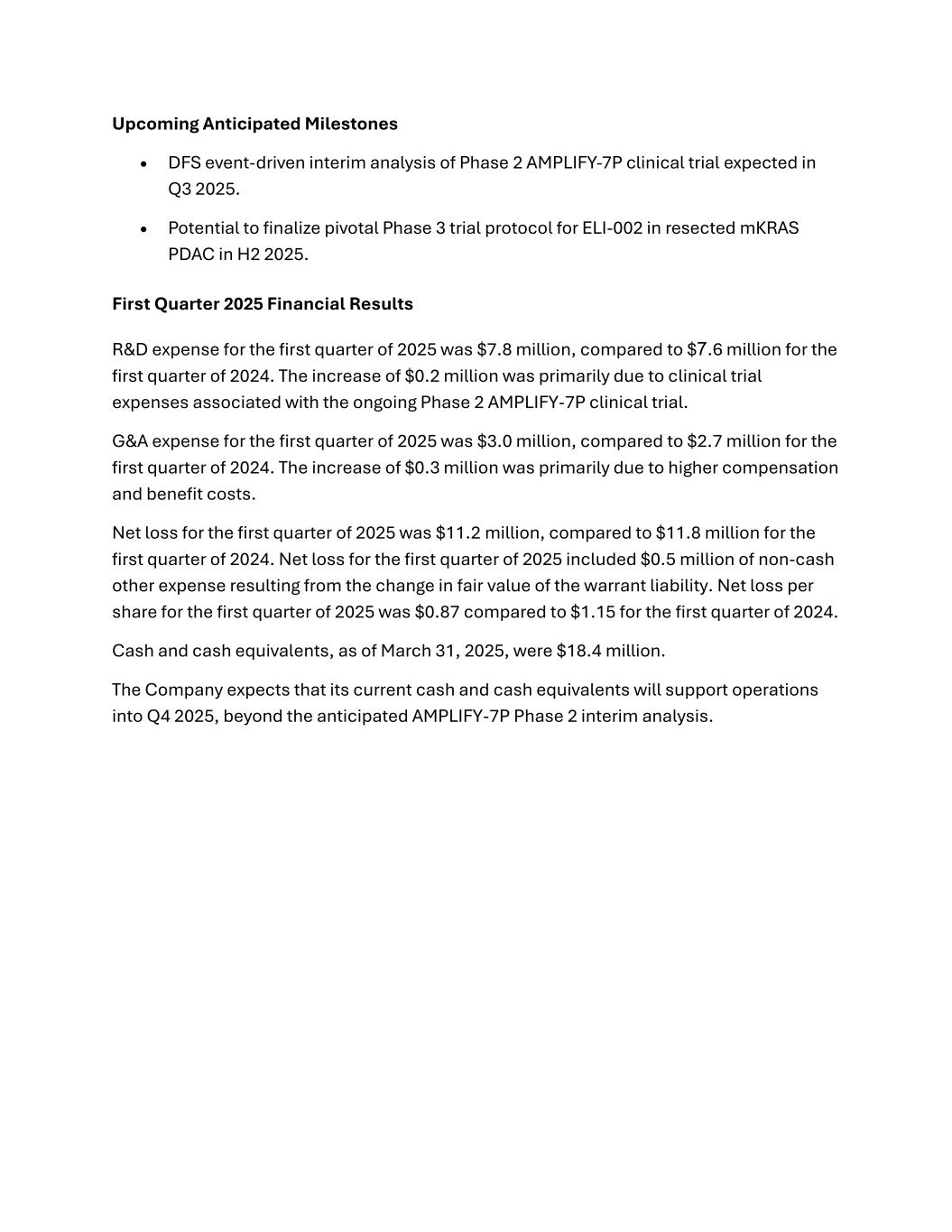Upcoming Anticipated Milestones • DFS event-driven interim analysis of Phase 2 AMPLIFY-7P clinical trial expected in Q3 2025. • Potential to finalize pivotal Phase 3 trial protocol for ELI-002 in resected mKRAS PDAC in H2 2025. First Quarter 2025 Financial Results R&D expense for the first quarter of 2025 was $7.8 million, compared to $7.6 million for the first quarter of 2024. The increase of $0.2 million was primarily due to clinical trial expenses associated with the ongoing Phase 2 AMPLIFY-7P clinical trial. G&A expense for the first quarter of 2025 was $3.0 million, compared to $2.7 million for the first quarter of 2024. The increase of $0.3 million was primarily due to higher compensation and benefit costs. Net loss for the first quarter of 2025 was $11.2 million, compared to $11.8 million for the first quarter of 2024. Net loss for the first quarter of 2025 included $0.5 million of non-cash other expense resulting from the change in fair value of the warrant liability. Net loss per share for the first quarter of 2025 was $0.87 compared to $1.15 for the first quarter of 2024. Cash and cash equivalents, as of March 31, 2025, were $18.4 million. The Company expects that its current cash and cash equivalents will support operations into Q4 2025, beyond the anticipated AMPLIFY-7P Phase 2 interim analysis.