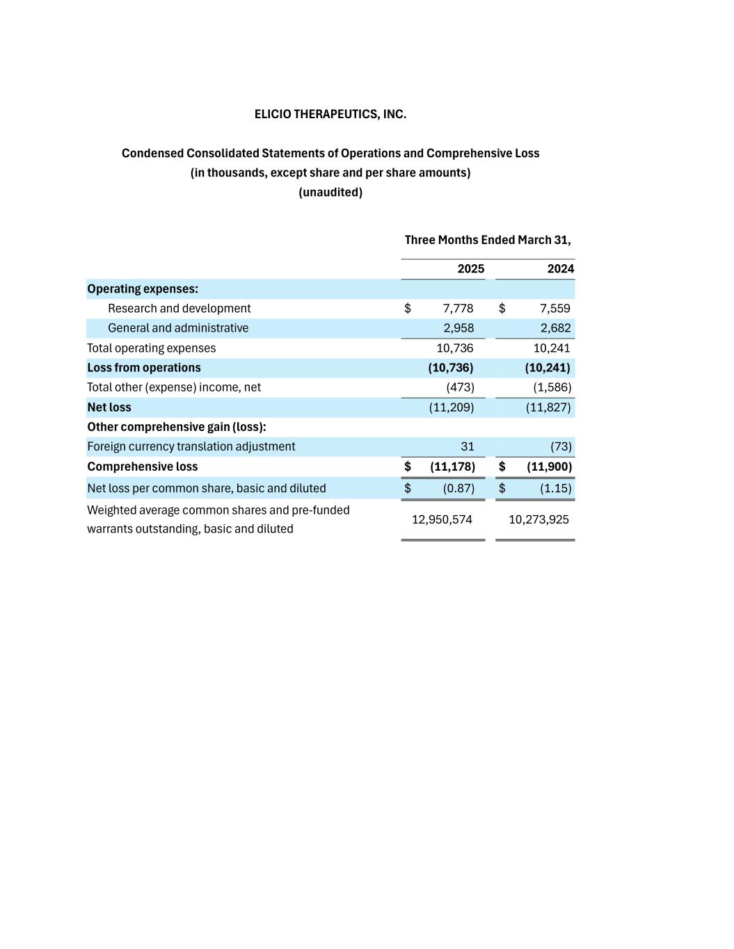 ELICIO THERAPEUTICS, INC. Condensed Consolidated Statements of Operations and Comprehensive Loss (in thousands, except share and per share amounts) (unaudited) Three Months Ended March 31, 2025 2024 Operating expenses: Research and development $ 7,778 $ 7,559 General and administrative 2,958 2,682 Total operating expenses 10,736 10,241 Loss from operations (10,736) (10,241) Total other (expense) income, net (473) (1,586) Net loss (11,209) (11,827) Other comprehensive gain (loss): Foreign currency translation adjustment 31 (73) Comprehensive loss $ (11,178) $ (11,900) Net loss per common share, basic and diluted $ (0.87) $ (1.15) Weighted average common shares and pre-funded warrants outstanding, basic and diluted 12,950,574 10,273,925