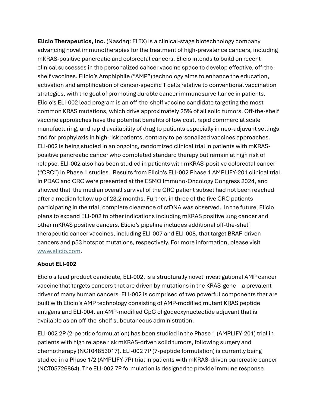 Elicio Therapeutics, Inc. (Nasdaq: ELTX) is a clinical-stage biotechnology company advancing novel immunotherapies for the treatment of high-prevalence cancers, including mKRAS-positive pancreatic and colorectal cancers. Elicio intends to build on recent clinical successes in the personalized cancer vaccine space to develop effective, off-the- shelf vaccines. Elicio’s Amphiphile (“AMP”) technology aims to enhance the education, activation and amplification of cancer-specific T cells relative to conventional vaccination strategies, with the goal of promoting durable cancer immunosurveillance in patients. Elicio’s ELI-002 lead program is an off-the-shelf vaccine candidate targeting the most common KRAS mutations, which drive approximately 25% of all solid tumors. Off-the-shelf vaccine approaches have the potential benefits of low cost, rapid commercial scale manufacturing, and rapid availability of drug to patients especially in neo-adjuvant settings and for prophylaxis in high-risk patients, contrary to personalized vaccines approaches. ELI-002 is being studied in an ongoing, randomized clinical trial in patients with mKRAS- positive pancreatic cancer who completed standard therapy but remain at high risk of relapse. ELI-002 also has been studied in patients with mKRAS-positive colorectal cancer (“CRC”) in Phase 1 studies. Results from Elicio’s ELI-002 Phase 1 AMPLIFY-201 clinical trial in PDAC and CRC were presented at the ESMO Immuno-Oncology Congress 2024, and showed that the median overall survival of the CRC patient subset had not been reached after a median follow up of 23.2 months. Further, in three of the five CRC patients participating in the trial, complete clearance of ctDNA was observed. In the future, Elicio plans to expand ELI-002 to other indications including mKRAS positive lung cancer and other mKRAS positive cancers. Elicio’s pipeline includes additional off-the-shelf therapeutic cancer vaccines, including ELI-007 and ELI-008, that target BRAF-driven cancers and p53 hotspot mutations, respectively. For more information, please visit www.elicio.com. About ELI-002 Elicio’s lead product candidate, ELI-002, is a structurally novel investigational AMP cancer vaccine that targets cancers that are driven by mutations in the KRAS-gene—a prevalent driver of many human cancers. ELI-002 is comprised of two powerful components that are built with Elicio’s AMP technology consisting of AMP-modified mutant KRAS peptide antigens and ELI-004, an AMP-modified CpG oligodeoxynucleotide adjuvant that is available as an off-the-shelf subcutaneous administration. ELI-002 2P (2-peptide formulation) has been studied in the Phase 1 (AMPLIFY-201) trial in patients with high relapse risk mKRAS-driven solid tumors, following surgery and chemotherapy (NCT04853017). ELI-002 7P (7-peptide formulation) is currently being studied in a Phase 1/2 (AMPLIFY-7P) trial in patients with mKRAS-driven pancreatic cancer (NCT05726864). The ELI-002 7P formulation is designed to provide immune response