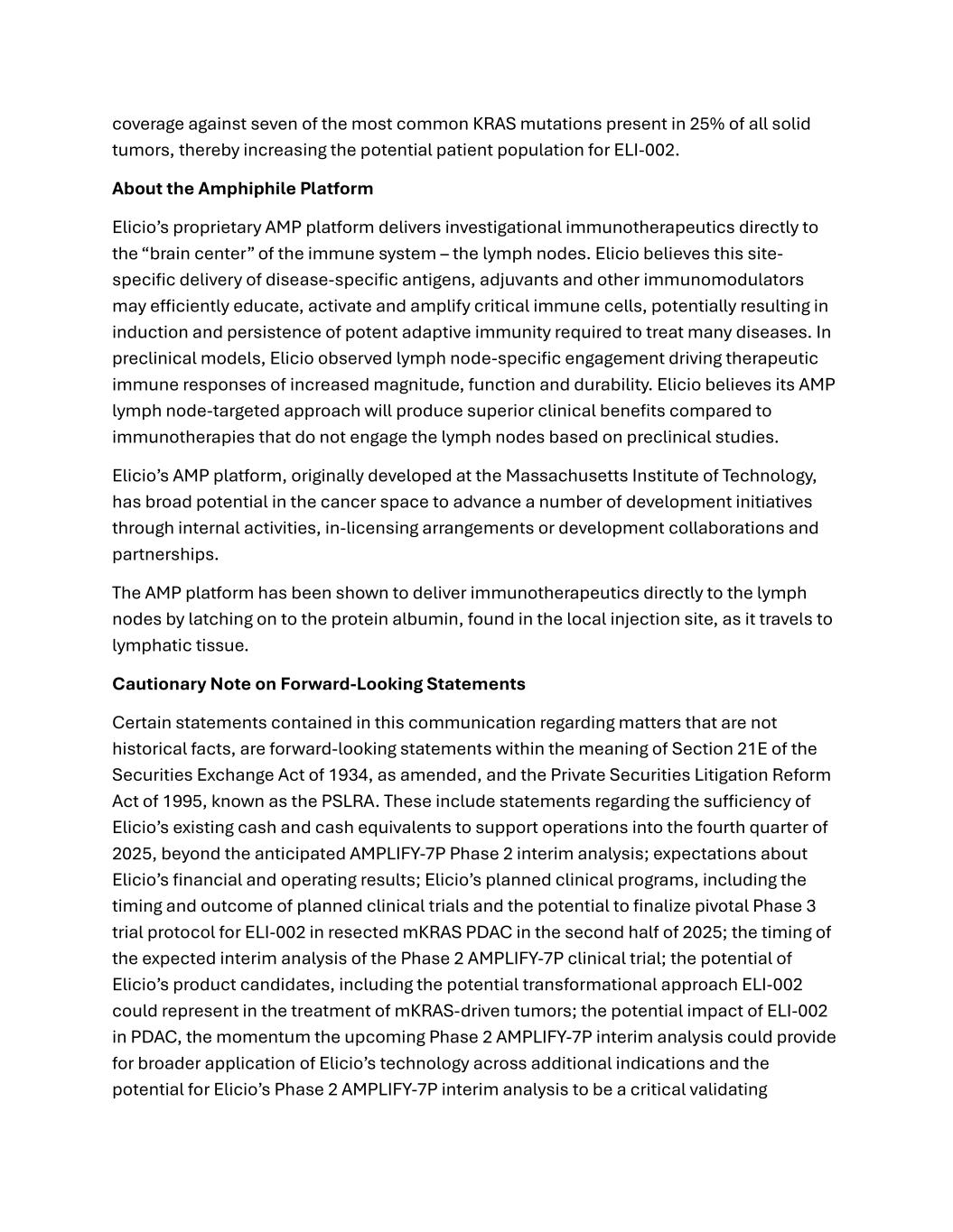 coverage against seven of the most common KRAS mutations present in 25% of all solid tumors, thereby increasing the potential patient population for ELI-002. About the Amphiphile Platform Elicio’s proprietary AMP platform delivers investigational immunotherapeutics directly to the “brain center” of the immune system – the lymph nodes. Elicio believes this site- specific delivery of disease-specific antigens, adjuvants and other immunomodulators may efficiently educate, activate and amplify critical immune cells, potentially resulting in induction and persistence of potent adaptive immunity required to treat many diseases. In preclinical models, Elicio observed lymph node-specific engagement driving therapeutic immune responses of increased magnitude, function and durability. Elicio believes its AMP lymph node-targeted approach will produce superior clinical benefits compared to immunotherapies that do not engage the lymph nodes based on preclinical studies. Elicio’s AMP platform, originally developed at the Massachusetts Institute of Technology, has broad potential in the cancer space to advance a number of development initiatives through internal activities, in-licensing arrangements or development collaborations and partnerships. The AMP platform has been shown to deliver immunotherapeutics directly to the lymph nodes by latching on to the protein albumin, found in the local injection site, as it travels to lymphatic tissue. Cautionary Note on Forward-Looking Statements Certain statements contained in this communication regarding matters that are not historical facts, are forward-looking statements within the meaning of Section 21E of the Securities Exchange Act of 1934, as amended, and the Private Securities Litigation Reform Act of 1995, known as the PSLRA. These include statements regarding the sufficiency of Elicio’s existing cash and cash equivalents to support operations into the fourth quarter of 2025, beyond the anticipated AMPLIFY-7P Phase 2 interim analysis; expectations about Elicio’s financial and operating results; Elicio’s planned clinical programs, including the timing and outcome of planned clinical trials and the potential to finalize pivotal Phase 3 trial protocol for ELI-002 in resected mKRAS PDAC in the second half of 2025; the timing of the expected interim analysis of the Phase 2 AMPLIFY-7P clinical trial; the potential of Elicio’s product candidates, including the potential transformational approach ELI-002 could represent in the treatment of mKRAS-driven tumors; the potential impact of ELI-002 in PDAC, the momentum the upcoming Phase 2 AMPLIFY-7P interim analysis could provide for broader application of Elicio’s technology across additional indications and the potential for Elicio’s Phase 2 AMPLIFY-7P interim analysis to be a critical validating