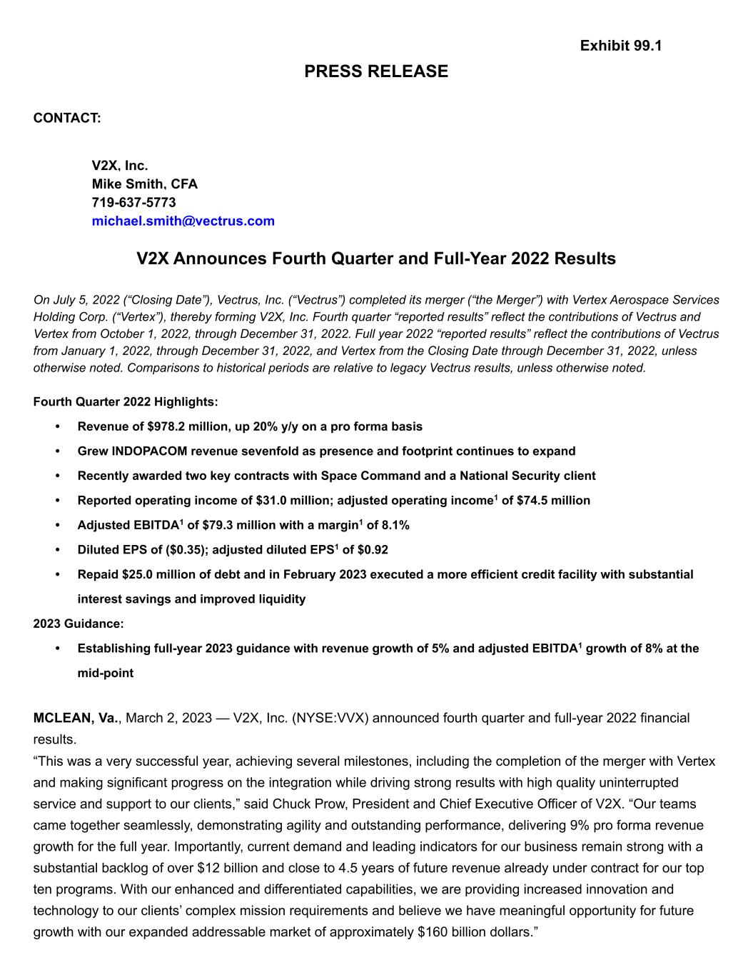 PRESS RELEASE CONTACT: V2X, Inc. Mike Smith, CFA 719-637-5773 michael.smith@vectrus.com V2X Announces Fourth Quarter and Full-Year 2022 Results On July 5, 2022 (“Closing Date”), Vectrus, Inc. (“Vectrus”) completed its merger (“the Merger”) with Vertex Aerospace Services Holding Corp. (“Vertex”), thereby forming V2X, Inc. Fourth quarter “reported results” reflect the contributions of Vectrus and Vertex from October 1, 2022, through December 31, 2022. Full year 2022 “reported results” reflect the contributions of Vectrus from January 1, 2022, through December 31, 2022, and Vertex from the Closing Date through December 31, 2022, unless otherwise noted. Comparisons to historical periods are relative to legacy Vectrus results, unless otherwise noted. Fourth Quarter 2022 Highlights: • Revenue of $978.2 million, up 20% y/y on a pro forma basis • Grew INDOPACOM revenue sevenfold as presence and footprint continues to expand • Recently awarded two key contracts with Space Command and a National Security client • Reported operating income of $31.0 million; adjusted operating income1 of $74.5 million • Adjusted EBITDA1 of $79.3 million with a margin1 of 8.1% • Diluted EPS of ($0.35); adjusted diluted EPS1 of $0.92 • Repaid $25.0 million of debt and in February 2023 executed a more efficient credit facility with substantial interest savings and improved liquidity 2023 Guidance: • Establishing full-year 2023 guidance with revenue growth of 5% and adjusted EBITDA1 growth of 8% at the mid-point MCLEAN, Va., March 2, 2023 — V2X, Inc. (NYSE:VVX) announced fourth quarter and full-year 2022 financial results. “This was a very successful year, achieving several milestones, including the completion of the merger with Vertex and making significant progress on the integration while driving strong results with high quality uninterrupted service and support to our clients,” said Chuck Prow, President and Chief Executive Officer of V2X. “Our teams came together seamlessly, demonstrating agility and outstanding performance, delivering 9% pro forma revenue growth for the full year. Importantly, current demand and leading indicators for our business remain strong with a substantial backlog of over $12 billion and close to 4.5 years of future revenue already under contract for our top ten programs. With our enhanced and differentiated capabilities, we are providing increased innovation and technology to our clients’ complex mission requirements and believe we have meaningful opportunity for future growth with our expanded addressable market of approximately $160 billion dollars.” Exhibit 99.1