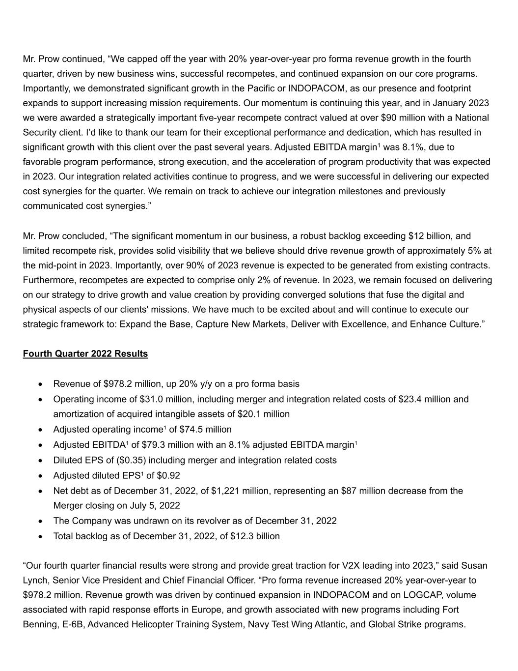 Mr. Prow continued, “We capped off the year with 20% year-over-year pro forma revenue growth in the fourth quarter, driven by new business wins, successful recompetes, and continued expansion on our core programs. Importantly, we demonstrated significant growth in the Pacific or INDOPACOM, as our presence and footprint expands to support increasing mission requirements. Our momentum is continuing this year, and in January 2023 we were awarded a strategically important five-year recompete contract valued at over $90 million with a National Security client. I’d like to thank our team for their exceptional performance and dedication, which has resulted in significant growth with this client over the past several years. Adjusted EBITDA margin1 was 8.1%, due to favorable program performance, strong execution, and the acceleration of program productivity that was expected in 2023. Our integration related activities continue to progress, and we were successful in delivering our expected cost synergies for the quarter. We remain on track to achieve our integration milestones and previously communicated cost synergies.” Mr. Prow concluded, “The significant momentum in our business, a robust backlog exceeding $12 billion, and limited recompete risk, provides solid visibility that we believe should drive revenue growth of approximately 5% at the mid-point in 2023. Importantly, over 90% of 2023 revenue is expected to be generated from existing contracts. Furthermore, recompetes are expected to comprise only 2% of revenue. In 2023, we remain focused on delivering on our strategy to drive growth and value creation by providing converged solutions that fuse the digital and physical aspects of our clients' missions. We have much to be excited about and will continue to execute our strategic framework to: Expand the Base, Capture New Markets, Deliver with Excellence, and Enhance Culture.” Fourth Quarter 2022 Results • Revenue of $978.2 million, up 20% y/y on a pro forma basis • Operating income of $31.0 million, including merger and integration related costs of $23.4 million and amortization of acquired intangible assets of $20.1 million • Adjusted operating income1 of $74.5 million • Adjusted EBITDA1 of $79.3 million with an 8.1% adjusted EBITDA margin1 • Diluted EPS of ($0.35) including merger and integration related costs • Adjusted diluted EPS1 of $0.92 • Net debt as of December 31, 2022, of $1,221 million, representing an $87 million decrease from the Merger closing on July 5, 2022 • The Company was undrawn on its revolver as of December 31, 2022 • Total backlog as of December 31, 2022, of $12.3 billion “Our fourth quarter financial results were strong and provide great traction for V2X leading into 2023,” said Susan Lynch, Senior Vice President and Chief Financial Officer. “Pro forma revenue increased 20% year-over-year to $978.2 million. Revenue growth was driven by continued expansion in INDOPACOM and on LOGCAP, volume associated with rapid response efforts in Europe, and growth associated with new programs including Fort Benning, E-6B, Advanced Helicopter Training System, Navy Test Wing Atlantic, and Global Strike programs.