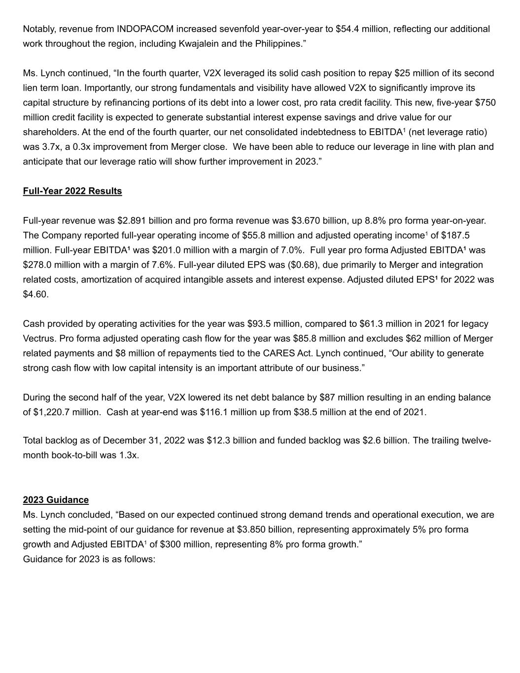 Notably, revenue from INDOPACOM increased sevenfold year-over-year to $54.4 million, reflecting our additional work throughout the region, including Kwajalein and the Philippines.” Ms. Lynch continued, “In the fourth quarter, V2X leveraged its solid cash position to repay $25 million of its second lien term loan. Importantly, our strong fundamentals and visibility have allowed V2X to significantly improve its capital structure by refinancing portions of its debt into a lower cost, pro rata credit facility. This new, five-year $750 million credit facility is expected to generate substantial interest expense savings and drive value for our shareholders. At the end of the fourth quarter, our net consolidated indebtedness to EBITDA1 (net leverage ratio) was 3.7x, a 0.3x improvement from Merger close. We have been able to reduce our leverage in line with plan and anticipate that our leverage ratio will show further improvement in 2023.” Full-Year 2022 Results Full-year revenue was $2.891 billion and pro forma revenue was $3.670 billion, up 8.8% pro forma year-on-year. The Company reported full-year operating income of $55.8 million and adjusted operating income1 of $187.5 million. Full-year EBITDA1 was $201.0 million with a margin of 7.0%. Full year pro forma Adjusted EBITDA1 was $278.0 million with a margin of 7.6%. Full-year diluted EPS was ($0.68), due primarily to Merger and integration related costs, amortization of acquired intangible assets and interest expense. Adjusted diluted EPS1 for 2022 was $4.60. Cash provided by operating activities for the year was $93.5 million, compared to $61.3 million in 2021 for legacy Vectrus. Pro forma adjusted operating cash flow for the year was $85.8 million and excludes $62 million of Merger related payments and $8 million of repayments tied to the CARES Act. Lynch continued, “Our ability to generate strong cash flow with low capital intensity is an important attribute of our business.” During the second half of the year, V2X lowered its net debt balance by $87 million resulting in an ending balance of $1,220.7 million. Cash at year-end was $116.1 million up from $38.5 million at the end of 2021. Total backlog as of December 31, 2022 was $12.3 billion and funded backlog was $2.6 billion. The trailing twelve- month book-to-bill was 1.3x. 2023 Guidance Ms. Lynch concluded, “Based on our expected continued strong demand trends and operational execution, we are setting the mid-point of our guidance for revenue at $3.850 billion, representing approximately 5% pro forma growth and Adjusted EBITDA1 of $300 million, representing 8% pro forma growth.” Guidance for 2023 is as follows: