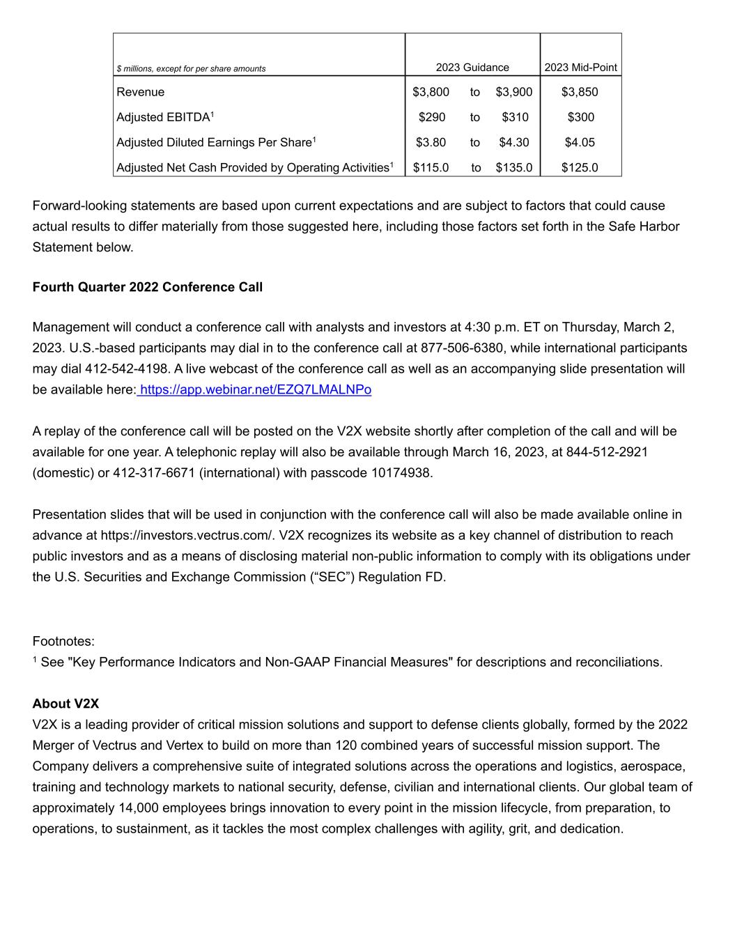 $ millions, except for per share amounts 2023 Guidance 2023 Mid-Point Revenue $3,800 to $3,900 $3,850 Adjusted EBITDA1 $290 to $310 $300 Adjusted Diluted Earnings Per Share1 $3.80 to $4.30 $4.05 Adjusted Net Cash Provided by Operating Activities1 $115.0 to $135.0 $125.0 Forward-looking statements are based upon current expectations and are subject to factors that could cause actual results to differ materially from those suggested here, including those factors set forth in the Safe Harbor Statement below. Fourth Quarter 2022 Conference Call Management will conduct a conference call with analysts and investors at 4:30 p.m. ET on Thursday, March 2, 2023. U.S.-based participants may dial in to the conference call at 877-506-6380, while international participants may dial 412-542-4198. A live webcast of the conference call as well as an accompanying slide presentation will be available here: https://app.webinar.net/EZQ7LMALNPo A replay of the conference call will be posted on the V2X website shortly after completion of the call and will be available for one year. A telephonic replay will also be available through March 16, 2023, at 844-512-2921 (domestic) or 412-317-6671 (international) with passcode 10174938. Presentation slides that will be used in conjunction with the conference call will also be made available online in advance at https://investors.vectrus.com/. V2X recognizes its website as a key channel of distribution to reach public investors and as a means of disclosing material non-public information to comply with its obligations under the U.S. Securities and Exchange Commission (“SEC”) Regulation FD. Footnotes: 1 See "Key Performance Indicators and Non-GAAP Financial Measures" for descriptions and reconciliations. About V2X V2X is a leading provider of critical mission solutions and support to defense clients globally, formed by the 2022 Merger of Vectrus and Vertex to build on more than 120 combined years of successful mission support. The Company delivers a comprehensive suite of integrated solutions across the operations and logistics, aerospace, training and technology markets to national security, defense, civilian and international clients. Our global team of approximately 14,000 employees brings innovation to every point in the mission lifecycle, from preparation, to operations, to sustainment, as it tackles the most complex challenges with agility, grit, and dedication.