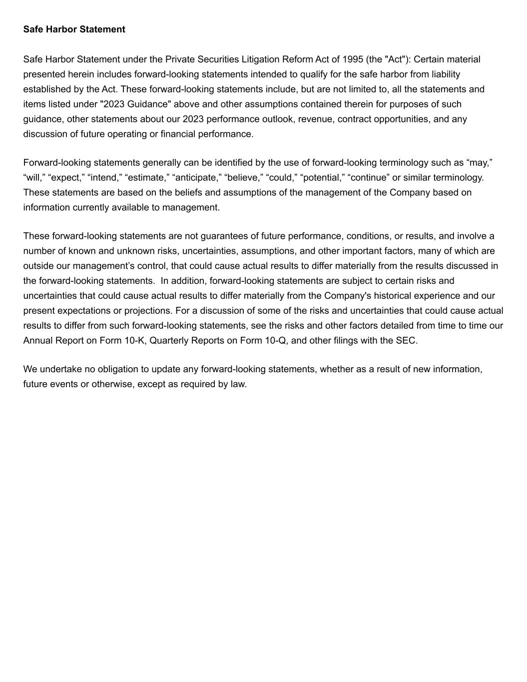 Safe Harbor Statement Safe Harbor Statement under the Private Securities Litigation Reform Act of 1995 (the "Act"): Certain material presented herein includes forward-looking statements intended to qualify for the safe harbor from liability established by the Act. These forward-looking statements include, but are not limited to, all the statements and items listed under "2023 Guidance" above and other assumptions contained therein for purposes of such guidance, other statements about our 2023 performance outlook, revenue, contract opportunities, and any discussion of future operating or financial performance. Forward-looking statements generally can be identified by the use of forward-looking terminology such as “may,” “will,” “expect,” “intend,” “estimate,” “anticipate,” “believe,” “could,” “potential,” “continue” or similar terminology. These statements are based on the beliefs and assumptions of the management of the Company based on information currently available to management. These forward-looking statements are not guarantees of future performance, conditions, or results, and involve a number of known and unknown risks, uncertainties, assumptions, and other important factors, many of which are outside our management’s control, that could cause actual results to differ materially from the results discussed in the forward-looking statements. In addition, forward-looking statements are subject to certain risks and uncertainties that could cause actual results to differ materially from the Company's historical experience and our present expectations or projections. For a discussion of some of the risks and uncertainties that could cause actual results to differ from such forward-looking statements, see the risks and other factors detailed from time to time our Annual Report on Form 10-K, Quarterly Reports on Form 10-Q, and other filings with the SEC. We undertake no obligation to update any forward-looking statements, whether as a result of new information, future events or otherwise, except as required by law.