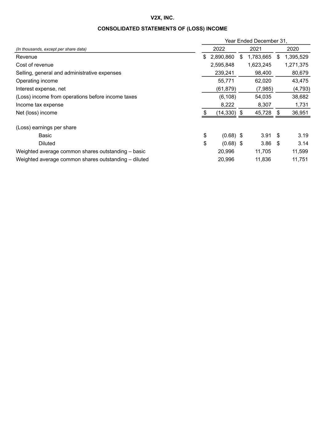 V2X, INC. CONSOLIDATED STATEMENTS OF (LOSS) INCOME Year Ended December 31, (In thousands, except per share data) 2022 2021 2020 Revenue $ 2,890,860 $ 1,783,665 $ 1,395,529 Cost of revenue 2,595,848 1,623,245 1,271,375 Selling, general and administrative expenses 239,241 98,400 80,679 Operating income 55,771 62,020 43,475 Interest expense, net (61,879) (7,985) (4,793) (Loss) income from operations before income taxes (6,108) 54,035 38,682 Income tax expense 8,222 8,307 1,731 Net (loss) income $ (14,330) $ 45,728 $ 36,951 (Loss) earnings per share Basic $ (0.68) $ 3.91 $ 3.19 Diluted $ (0.68) $ 3.86 $ 3.14 Weighted average common shares outstanding – basic 20,996 11,705 11,599 Weighted average common shares outstanding – diluted 20,996 11,836 11,751