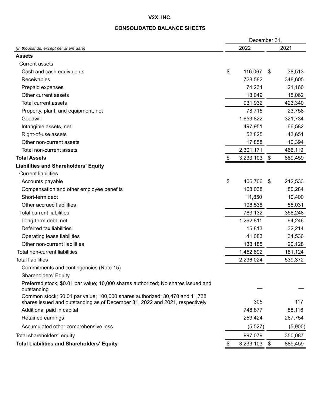 V2X, INC. CONSOLIDATED BALANCE SHEETS December 31, (In thousands, except per share data) 2022 2021 Assets Current assets Cash and cash equivalents $ 116,067 $ 38,513 Receivables 728,582 348,605 Prepaid expenses 74,234 21,160 Other current assets 13,049 15,062 Total current assets 931,932 423,340 Property, plant, and equipment, net 78,715 23,758 Goodwill 1,653,822 321,734 Intangible assets, net 497,951 66,582 Right-of-use assets 52,825 43,651 Other non-current assets 17,858 10,394 Total non-current assets 2,301,171 466,119 Total Assets $ 3,233,103 $ 889,459 Liabilities and Shareholders' Equity Current liabilities Accounts payable $ 406,706 $ 212,533 Compensation and other employee benefits 168,038 80,284 Short-term debt 11,850 10,400 Other accrued liabilities 196,538 55,031 Total current liabilities 783,132 358,248 Long-term debt, net 1,262,811 94,246 Deferred tax liabilities 15,813 32,214 Operating lease liabilities 41,083 34,536 Other non-current liabilities 133,185 20,128 Total non-current liabilities 1,452,892 181,124 Total liabilities 2,236,024 539,372 Commitments and contingencies (Note 15) Shareholders' Equity Preferred stock; $0.01 par value; 10,000 shares authorized; No shares issued and outstanding — — Common stock; $0.01 par value; 100,000 shares authorized; 30,470 and 11,738 shares issued and outstanding as of December 31, 2022 and 2021, respectively 305 117 Additional paid in capital 748,877 88,116 Retained earnings 253,424 267,754 Accumulated other comprehensive loss (5,527) (5,900) Total shareholders' equity 997,079 350,087 Total Liabilities and Shareholders' Equity $ 3,233,103 $ 889,459