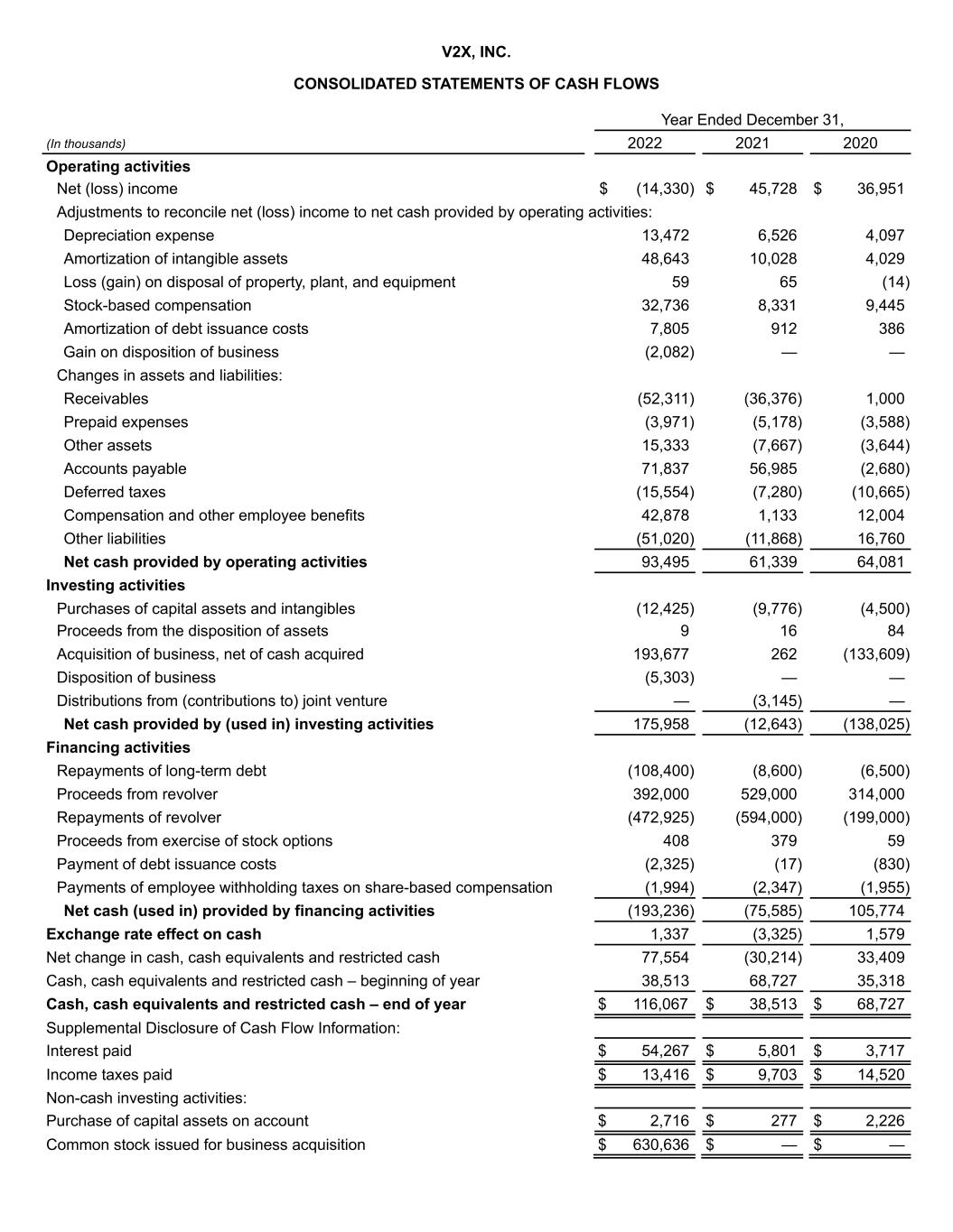V2X, INC. CONSOLIDATED STATEMENTS OF CASH FLOWS Year Ended December 31, (In thousands) 2022 2021 2020 Operating activities Net (loss) income $ (14,330) $ 45,728 $ 36,951 Adjustments to reconcile net (loss) income to net cash provided by operating activities: Depreciation expense 13,472 6,526 4,097 Amortization of intangible assets 48,643 10,028 4,029 Loss (gain) on disposal of property, plant, and equipment 59 65 (14) Stock-based compensation 32,736 8,331 9,445 Amortization of debt issuance costs 7,805 912 386 Gain on disposition of business (2,082) — — Changes in assets and liabilities: Receivables (52,311) (36,376) 1,000 Prepaid expenses (3,971) (5,178) (3,588) Other assets 15,333 (7,667) (3,644) Accounts payable 71,837 56,985 (2,680) Deferred taxes (15,554) (7,280) (10,665) Compensation and other employee benefits 42,878 1,133 12,004 Other liabilities (51,020) (11,868) 16,760 Net cash provided by operating activities 93,495 61,339 64,081 Investing activities Purchases of capital assets and intangibles (12,425) (9,776) (4,500) Proceeds from the disposition of assets 9 16 84 Acquisition of business, net of cash acquired 193,677 262 (133,609) Disposition of business (5,303) — — Distributions from (contributions to) joint venture — (3,145) — Net cash provided by (used in) investing activities 175,958 (12,643) (138,025) Financing activities Repayments of long-term debt (108,400) (8,600) (6,500) Proceeds from revolver 392,000 529,000 314,000 Repayments of revolver (472,925) (594,000) (199,000) Proceeds from exercise of stock options 408 379 59 Payment of debt issuance costs (2,325) (17) (830) Payments of employee withholding taxes on share-based compensation (1,994) (2,347) (1,955) Net cash (used in) provided by financing activities (193,236) (75,585) 105,774 Exchange rate effect on cash 1,337 (3,325) 1,579 Net change in cash, cash equivalents and restricted cash 77,554 (30,214) 33,409 Cash, cash equivalents and restricted cash – beginning of year 38,513 68,727 35,318 Cash, cash equivalents and restricted cash – end of year $ 116,067 $ 38,513 $ 68,727 Supplemental Disclosure of Cash Flow Information: Interest paid $ 54,267 $ 5,801 $ 3,717 Income taxes paid $ 13,416 $ 9,703 $ 14,520 Non-cash investing activities: Purchase of capital assets on account $ 2,716 $ 277 $ 2,226 Common stock issued for business acquisition $ 630,636 $ — $ —