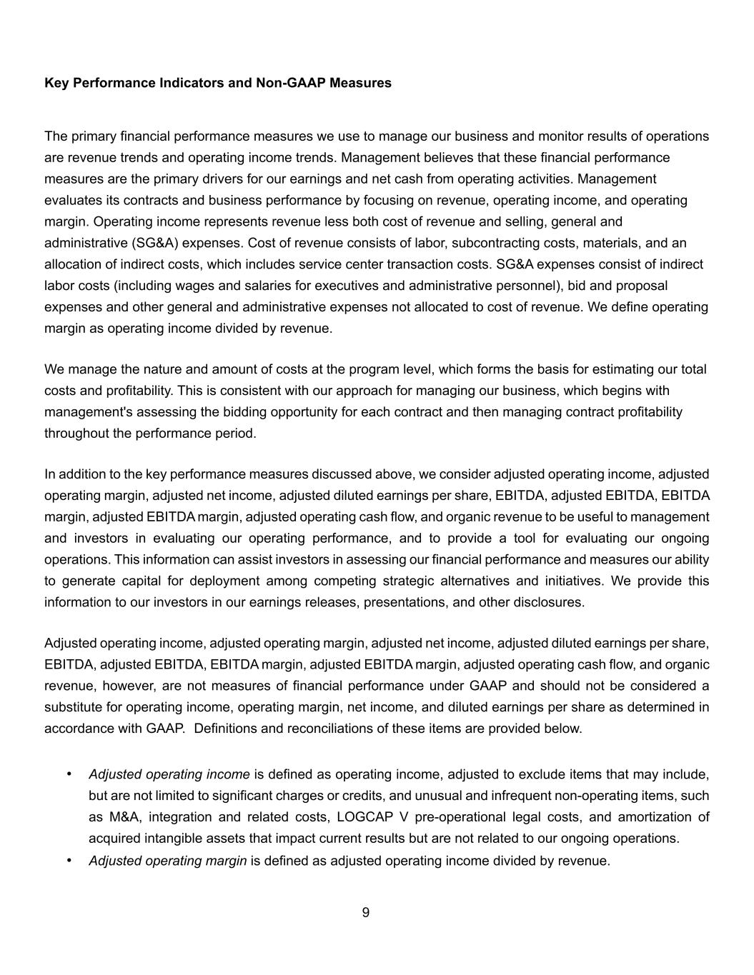 9 Key Performance Indicators and Non-GAAP Measures The primary financial performance measures we use to manage our business and monitor results of operations are revenue trends and operating income trends. Management believes that these financial performance measures are the primary drivers for our earnings and net cash from operating activities. Management evaluates its contracts and business performance by focusing on revenue, operating income, and operating margin. Operating income represents revenue less both cost of revenue and selling, general and administrative (SG&A) expenses. Cost of revenue consists of labor, subcontracting costs, materials, and an allocation of indirect costs, which includes service center transaction costs. SG&A expenses consist of indirect labor costs (including wages and salaries for executives and administrative personnel), bid and proposal expenses and other general and administrative expenses not allocated to cost of revenue. We define operating margin as operating income divided by revenue. We manage the nature and amount of costs at the program level, which forms the basis for estimating our total costs and profitability. This is consistent with our approach for managing our business, which begins with management's assessing the bidding opportunity for each contract and then managing contract profitability throughout the performance period. In addition to the key performance measures discussed above, we consider adjusted operating income, adjusted operating margin, adjusted net income, adjusted diluted earnings per share, EBITDA, adjusted EBITDA, EBITDA margin, adjusted EBITDA margin, adjusted operating cash flow, and organic revenue to be useful to management and investors in evaluating our operating performance, and to provide a tool for evaluating our ongoing operations. This information can assist investors in assessing our financial performance and measures our ability to generate capital for deployment among competing strategic alternatives and initiatives. We provide this information to our investors in our earnings releases, presentations, and other disclosures. Adjusted operating income, adjusted operating margin, adjusted net income, adjusted diluted earnings per share, EBITDA, adjusted EBITDA, EBITDA margin, adjusted EBITDA margin, adjusted operating cash flow, and organic revenue, however, are not measures of financial performance under GAAP and should not be considered a substitute for operating income, operating margin, net income, and diluted earnings per share as determined in accordance with GAAP. Definitions and reconciliations of these items are provided below. • Adjusted operating income is defined as operating income, adjusted to exclude items that may include, but are not limited to significant charges or credits, and unusual and infrequent non-operating items, such as M&A, integration and related costs, LOGCAP V pre-operational legal costs, and amortization of acquired intangible assets that impact current results but are not related to our ongoing operations. • Adjusted operating margin is defined as adjusted operating income divided by revenue.