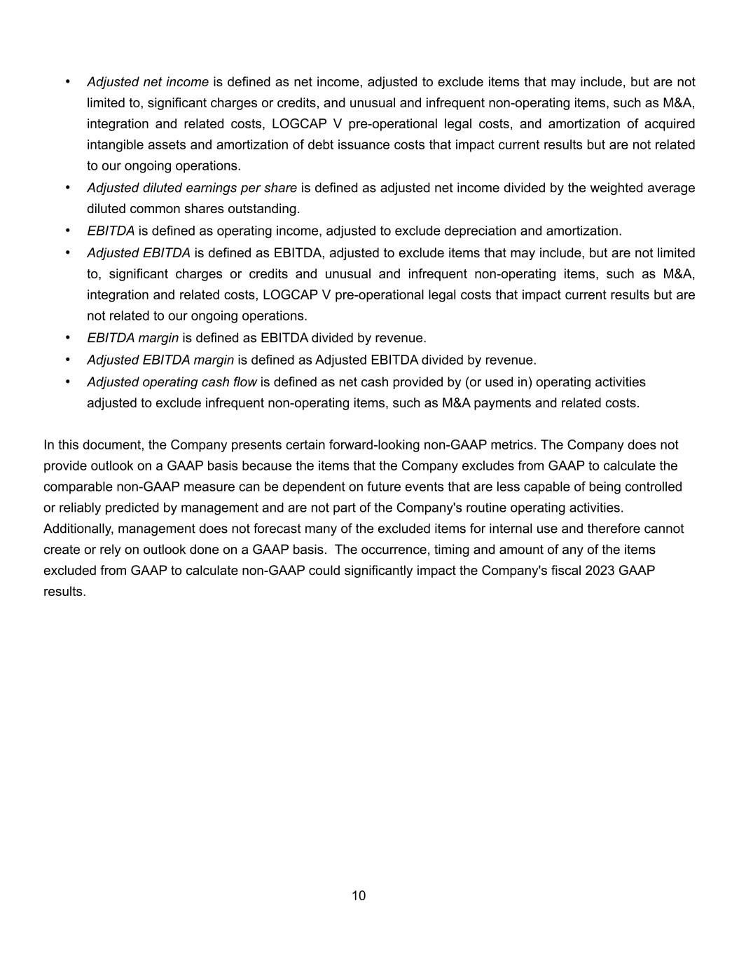 10 • Adjusted net income is defined as net income, adjusted to exclude items that may include, but are not limited to, significant charges or credits, and unusual and infrequent non-operating items, such as M&A, integration and related costs, LOGCAP V pre-operational legal costs, and amortization of acquired intangible assets and amortization of debt issuance costs that impact current results but are not related to our ongoing operations. • Adjusted diluted earnings per share is defined as adjusted net income divided by the weighted average diluted common shares outstanding. • EBITDA is defined as operating income, adjusted to exclude depreciation and amortization. • Adjusted EBITDA is defined as EBITDA, adjusted to exclude items that may include, but are not limited to, significant charges or credits and unusual and infrequent non-operating items, such as M&A, integration and related costs, LOGCAP V pre-operational legal costs that impact current results but are not related to our ongoing operations. • EBITDA margin is defined as EBITDA divided by revenue. • Adjusted EBITDA margin is defined as Adjusted EBITDA divided by revenue. • Adjusted operating cash flow is defined as net cash provided by (or used in) operating activities adjusted to exclude infrequent non-operating items, such as M&A payments and related costs. In this document, the Company presents certain forward-looking non-GAAP metrics. The Company does not provide outlook on a GAAP basis because the items that the Company excludes from GAAP to calculate the comparable non-GAAP measure can be dependent on future events that are less capable of being controlled or reliably predicted by management and are not part of the Company's routine operating activities. Additionally, management does not forecast many of the excluded items for internal use and therefore cannot create or rely on outlook done on a GAAP basis. The occurrence, timing and amount of any of the items excluded from GAAP to calculate non-GAAP could significantly impact the Company's fiscal 2023 GAAP results.