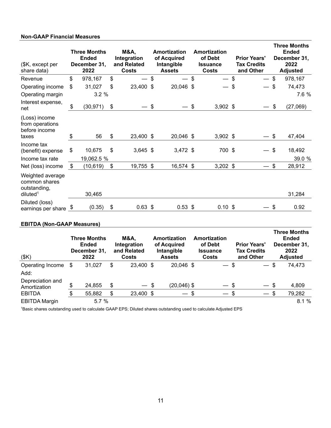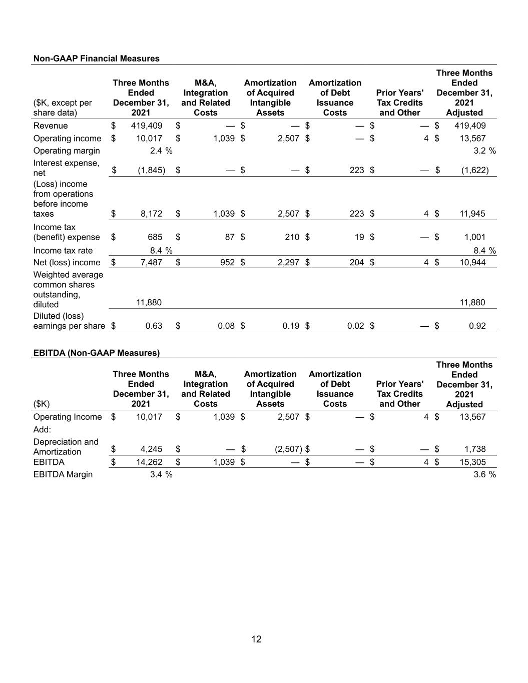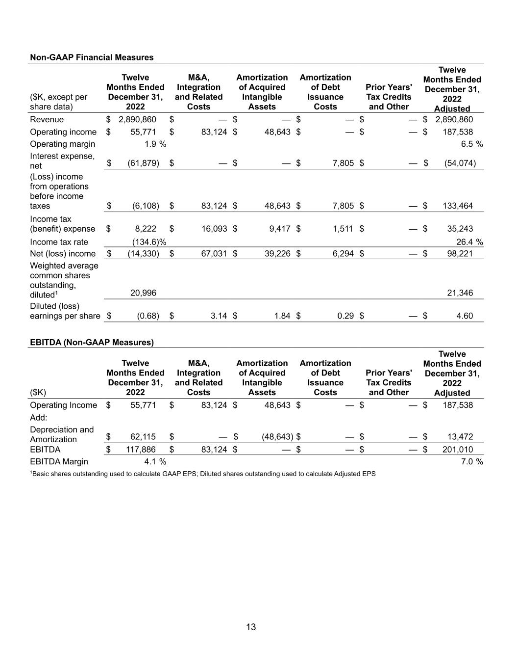 11 Non-GAAP Financial Measures ($K, except per share data) Three Months Ended December 31, 2022 M&A, Integration and Related Costs Amortization of Acquired Intangible Assets Amortization of Debt Issuance Costs Prior Years' Tax Credits and Other Three Months Ended December 31, 2022 Adjusted Revenue $ 978,167 $ — $ — $ — $ — $ 978,167 Operating income $ 31,027 $ 23,400 $ 20,046 $ — $ — $ 74,473 Operating margin 3.2 % 7.6 % Interest expense, net $ (30,971) $ — $ — $ 3,902 $ — $ (27,069) (Loss) income from operations before income taxes $ 56 $ 23,400 $ 20,046 $ 3,902 $ — $ 47,404 Income tax (benefit) expense $ 10,675 $ 3,645 $ 3,472 $ 700 $ — $ 18,492 Income tax rate 19,062.5 % 39.0 % Net (loss) income $ (10,619) $ 19,755 $ 16,574 $ 3,202 $ — $ 28,912 Weighted average common shares outstanding, diluted1 30,465 31,284 Diluted (loss) earnings per share $ (0.35) $ 0.63 $ 0.53 $ 0.10 $ — $ 0.92 EBITDA (Non-GAAP Measures) ($K) Three Months Ended December 31, 2022 M&A, Integration and Related Costs Amortization of Acquired Intangible Assets Amortization of Debt Issuance Costs Prior Years' Tax Credits and Other Three Months Ended December 31, 2022 Adjusted Operating Income $ 31,027 $ 23,400 $ 20,046 $ — $ — $ 74,473 Add: Depreciation and Amortization $ 24,855 $ — $ (20,046) $ — $ — $ 4,809 EBITDA $ 55,882 $ 23,400 $ — $ — $ — $ 79,282 EBITDA Margin 5.7 % 8.1 % 1Basic shares outstanding used to calculate GAAP EPS; Diluted shares outstanding used to calculate Adjusted EPS