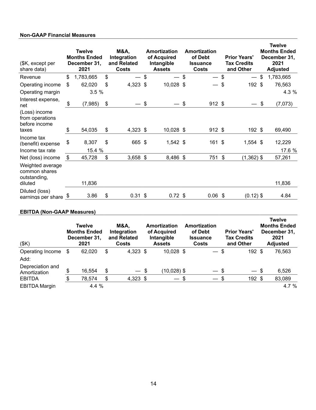 13 Non-GAAP Financial Measures ($K, except per share data) Twelve Months Ended December 31, 2022 M&A, Integration and Related Costs Amortization of Acquired Intangible Assets Amortization of Debt Issuance Costs Prior Years' Tax Credits and Other Twelve Months Ended December 31, 2022 Adjusted Revenue $ 2,890,860 $ — $ — $ — $ — $ 2,890,860 Operating income $ 55,771 $ 83,124 $ 48,643 $ — $ — $ 187,538 Operating margin 1.9 % 6.5 % Interest expense, net $ (61,879) $ — $ — $ 7,805 $ — $ (54,074) (Loss) income from operations before income taxes $ (6,108) $ 83,124 $ 48,643 $ 7,805 $ — $ 133,464 Income tax (benefit) expense $ 8,222 $ 16,093 $ 9,417 $ 1,511 $ — $ 35,243 Income tax rate (134.6) % 26.4 % Net (loss) income $ (14,330) $ 67,031 $ 39,226 $ 6,294 $ — $ 98,221 Weighted average common shares outstanding, diluted1 20,996 21,346 Diluted (loss) earnings per share $ (0.68) $ 3.14 $ 1.84 $ 0.29 $ — $ 4.60 EBITDA (Non-GAAP Measures) ($K) Twelve Months Ended December 31, 2022 M&A, Integration and Related Costs Amortization of Acquired Intangible Assets Amortization of Debt Issuance Costs Prior Years' Tax Credits and Other Twelve Months Ended December 31, 2022 Adjusted Operating Income $ 55,771 $ 83,124 $ 48,643 $ — $ — $ 187,538 Add: Depreciation and Amortization $ 62,115 $ — $ (48,643) $ — $ — $ 13,472 EBITDA $ 117,886 $ 83,124 $ — $ — $ — $ 201,010 EBITDA Margin 4.1 % 7.0 % 1Basic shares outstanding used to calculate GAAP EPS; Diluted shares outstanding used to calculate Adjusted EPS