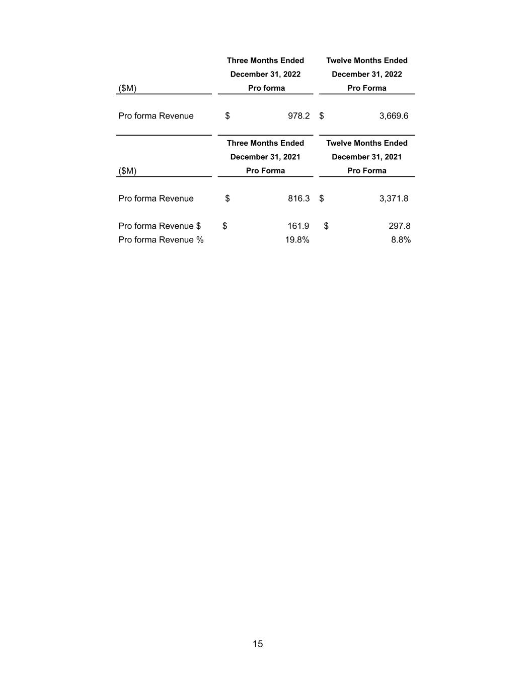 15 Three Months Ended Twelve Months Ended December 31, 2022 December 31, 2022 ($M) Pro forma Pro Forma Pro forma Revenue $ 978.2 $ 3,669.6 Three Months Ended Twelve Months Ended December 31, 2021 December 31, 2021 ($M) Pro Forma Pro Forma Pro forma Revenue $ 816.3 $ 3,371.8 Pro forma Revenue $ $ 161.9 $ 297.8 Pro forma Revenue % 19.8% 8.8%