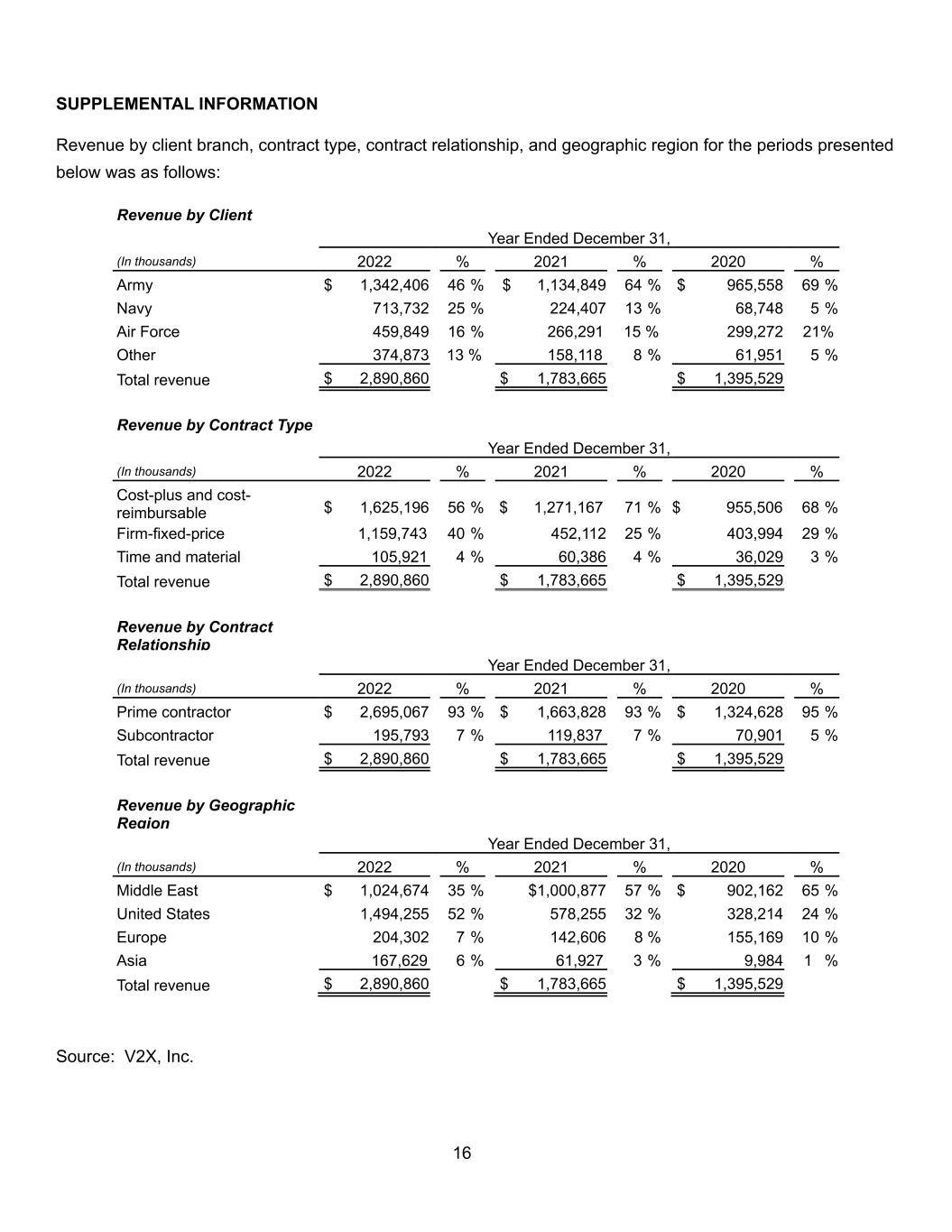 16 SUPPLEMENTAL INFORMATION Revenue by client branch, contract type, contract relationship, and geographic region for the periods presented below was as follows: Revenue by Client Year Ended December 31, (In thousands) 2022 % 2021 % 2020 % Army $ 1,342,406 46 % $ 1,134,849 64 % $ 965,558 69 % Navy 713,732 25 % 224,407 13 % 68,748 5 % Air Force 459,849 16 % 266,291 15 % 299,272 21% Other 374,873 13 % 158,118 8 % 61,951 5 % Total revenue $ 2,890,860 $ 1,783,665 $ 1,395,529 Revenue by Contract Type Year Ended December 31, (In thousands) 2022 % 2021 % 2020 % Cost-plus and cost- reimbursable $ 1,625,196 56 % $ 1,271,167 71 % $ 955,506 68 % Firm-fixed-price 1,159,743 40 % 452,112 25 % 403,994 29 % Time and material 105,921 4 % 60,386 4 % 36,029 3 % Total revenue $ 2,890,860 $ 1,783,665 $ 1,395,529 Revenue by Contract Relationship Year Ended December 31, (In thousands) 2022 % 2021 % 2020 % Prime contractor $ 2,695,067 93 % $ 1,663,828 93 % $ 1,324,628 95 % Subcontractor 195,793 7 % 119,837 7 % 70,901 5 % Total revenue $ 2,890,860 $ 1,783,665 $ 1,395,529 Revenue by Geographic Region Year Ended December 31, (In thousands) 2022 % 2021 % 2020 % Middle East $ 1,024,674 35 % $1,000,877 57 % $ 902,162 65 % United States 1,494,255 52 % 578,255 32 % 328,214 24 % Europe 204,302 7 % 142,606 8 % 155,169 10 % Asia 167,629 6 % 61,927 3 % 9,984 1 % Total revenue $ 2,890,860 $ 1,783,665 $ 1,395,529 Source: V2X, Inc.