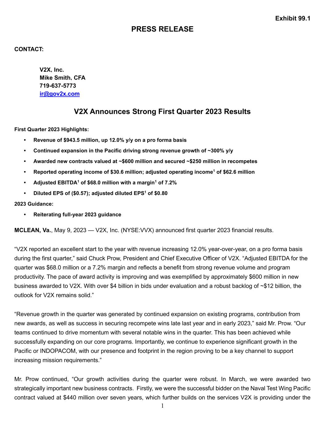 1 Exhibit 99.1 PRESS RELEASE CONTACT: V2X, Inc. Mike Smith, CFA 719-637-5773 ir@gov2x.com V2X Announces Strong First Quarter 2023 Results First Quarter 2023 Highlights: • Revenue of $943.5 million, up 12.0% y/y on a pro forma basis • Continued expansion in the Pacific driving strong revenue growth of ~300% y/y • Awarded new contracts valued at ~$600 million and secured ~$250 million in recompetes • Reported operating income of $30.6 million; adjusted operating income1 of $62.6 million • Adjusted EBITDA1 of $68.0 million with a margin1 of 7.2% • Diluted EPS of ($0.57); adjusted diluted EPS1 of $0.80 2023 Guidance: • Reiterating full-year 2023 guidance MCLEAN, Va., May 9, 2023 — V2X, Inc. (NYSE:VVX) announced first quarter 2023 financial results. “V2X reported an excellent start to the year with revenue increasing 12.0% year-over-year, on a pro forma basis during the first quarter,” said Chuck Prow, President and Chief Executive Officer of V2X. “Adjusted EBITDA for the quarter was $68.0 million or a 7.2% margin and reflects a benefit from strong revenue volume and program productivity. The pace of award activity is improving and was exemplified by approximately $600 million in new business awarded to V2X. With over $4 billion in bids under evaluation and a robust backlog of ~$12 billion, the outlook for V2X remains solid.” “Revenue growth in the quarter was generated by continued expansion on existing programs, contribution from new awards, as well as success in securing recompete wins late last year and in early 2023,” said Mr. Prow. “Our teams continued to drive momentum with several notable wins in the quarter. This has been achieved while successfully expanding on our core programs. Importantly, we continue to experience significant growth in the Pacific or INDOPACOM, with our presence and footprint in the region proving to be a key channel to support increasing mission requirements.” Mr. Prow continued, “Our growth activities during the quarter were robust. In March, we were awarded two strategically important new business contracts. Firstly, we were the successful bidder on the Naval Test Wing Pacific contract valued at $440 million over seven years, which further builds on the services V2X is providing under the