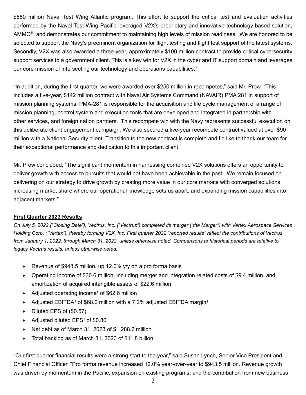 2 $880 million Naval Test Wing Atlantic program. This effort to support the critical test and evaluation activities performed by the Naval Test Wing Pacific leveraged V2X’s proprietary and innovative technology-based solution, AMMO®, and demonstrates our commitment to maintaining high levels of mission readiness. We are honored to be selected to support the Navy’s preeminent organization for flight testing and flight test support of the latest systems. Secondly, V2X was also awarded a three-year, approximately $100 million contract to provide critical cybersecurity support services to a government client. This is a key win for V2X in the cyber and IT support domain and leverages our core mission of intersecting our technology and operations capabilities.” “In addition, during the first quarter, we were awarded over $250 million in recompetes,” said Mr. Prow. “This includes a five-year, $142 million contract with Naval Air Systems Command (NAVAIR) PMA 281 in support of mission planning systems. PMA-281 is responsible for the acquisition and life cycle management of a range of mission planning, control system and execution tools that are developed and integrated in partnership with other services, and foreign nation partners. This recompete win with the Navy represents successful execution on this deliberate client engagement campaign. We also secured a five-year recompete contract valued at over $90 million with a National Security client. Transition to the new contract is complete and I’d like to thank our team for their exceptional performance and dedication to this important client.” Mr. Prow concluded, “The significant momentum in harnessing combined V2X solutions offers an opportunity to deliver growth with access to pursuits that would not have been achievable in the past. We remain focused on delivering on our strategy to drive growth by creating more value in our core markets with converged solutions, increasing market share where our operational knowledge sets us apart, and expanding mission capabilities into adjacent markets.” First Quarter 2023 Results On July 5, 2022 (“Closing Date”), Vectrus, Inc. (“Vectrus”) completed its merger (“the Merger”) with Vertex Aerospace Services Holding Corp. (“Vertex”), thereby forming V2X, Inc. First quarter 2022 “reported results” reflect the contributions of Vectrus from January 1, 2022, through March 31, 2022, unless otherwise noted. Comparisons to historical periods are relative to legacy Vectrus results, unless otherwise noted.  Revenue of $943.5 million, up 12.0% y/y on a pro forma basis  Operating income of $30.6 million, including merger and integration related costs of $9.4 million, and amortization of acquired intangible assets of $22.6 million  Adjusted operating income1 of $62.6 million  Adjusted EBITDA1 of $68.0 million with a 7.2% adjusted EBITDA margin1  Diluted EPS of ($0.57)  Adjusted diluted EPS1 of $0.80  Net debt as of March 31, 2023 of $1,288.6 million  Total backlog as of March 31, 2023 of $11.8 billion “Our first quarter financial results were a strong start to the year,” said Susan Lynch, Senior Vice President and Chief Financial Officer. “Pro forma revenue increased 12.0% year-over-year to $943.5 million. Revenue growth was driven by momentum in the Pacific, expansion on existing programs, and the contribution from new business