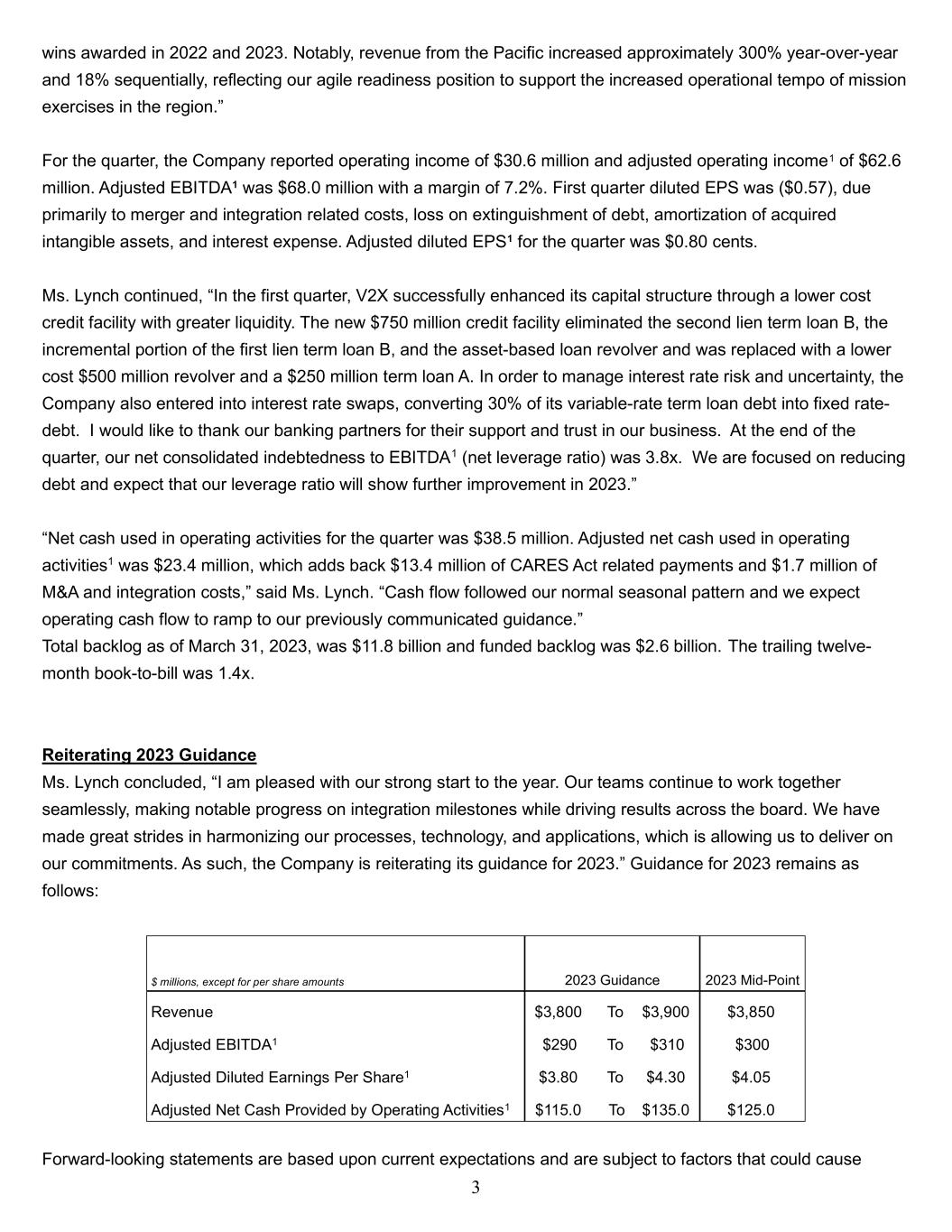 3 wins awarded in 2022 and 2023. Notably, revenue from the Pacific increased approximately 300% year-over-year and 18% sequentially, reflecting our agile readiness position to support the increased operational tempo of mission exercises in the region.” For the quarter, the Company reported operating income of $30.6 million and adjusted operating income1 of $62.6 million. Adjusted EBITDA1 was $68.0 million with a margin of 7.2%. First quarter diluted EPS was ($0.57), due primarily to merger and integration related costs, loss on extinguishment of debt, amortization of acquired intangible assets, and interest expense. Adjusted diluted EPS1 for the quarter was $0.80 cents. Ms. Lynch continued, “In the first quarter, V2X successfully enhanced its capital structure through a lower cost credit facility with greater liquidity. The new $750 million credit facility eliminated the second lien term loan B, the incremental portion of the first lien term loan B, and the asset-based loan revolver and was replaced with a lower cost $500 million revolver and a $250 million term loan A. In order to manage interest rate risk and uncertainty, the Company also entered into interest rate swaps, converting 30% of its variable-rate term loan debt into fixed rate- debt. I would like to thank our banking partners for their support and trust in our business. At the end of the quarter, our net consolidated indebtedness to EBITDA1 (net leverage ratio) was 3.8x. We are focused on reducing debt and expect that our leverage ratio will show further improvement in 2023.” “Net cash used in operating activities for the quarter was $38.5 million. Adjusted net cash used in operating activities1 was $23.4 million, which adds back $13.4 million of CARES Act related payments and $1.7 million of M&A and integration costs,” said Ms. Lynch. “Cash flow followed our normal seasonal pattern and we expect operating cash flow to ramp to our previously communicated guidance.” Total backlog as of March 31, 2023, was $11.8 billion and funded backlog was $2.6 billion. The trailing twelve- month book-to-bill was 1.4x. Reiterating 2023 Guidance Ms. Lynch concluded, “I am pleased with our strong start to the year. Our teams continue to work together seamlessly, making notable progress on integration milestones while driving results across the board. We have made great strides in harmonizing our processes, technology, and applications, which is allowing us to deliver on our commitments. As such, the Company is reiterating its guidance for 2023.” Guidance for 2023 remains as follows: $ millions, except for per share amounts 2023 Guidance 2023 Mid-Point Revenue $3,800 To $3,900 $3,850 Adjusted EBITDA1 $290 To $310 $300 Adjusted Diluted Earnings Per Share1 $3.80 To $4.30 $4.05 Adjusted Net Cash Provided by Operating Activities1 $115.0 To $135.0 $125.0 Forward-looking statements are based upon current expectations and are subject to factors that could cause