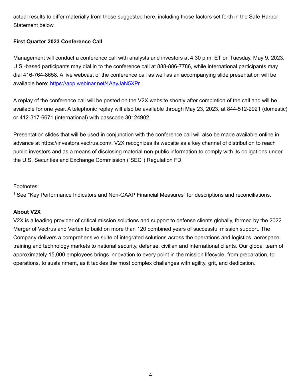 4 actual results to differ materially from those suggested here, including those factors set forth in the Safe Harbor Statement below. First Quarter 2023 Conference Call Management will conduct a conference call with analysts and investors at 4:30 p.m. ET on Tuesday, May 9, 2023. U.S.-based participants may dial in to the conference call at 888-886-7786, while international participants may dial 416-764-8658. A live webcast of the conference call as well as an accompanying slide presentation will be available here: https://app.webinar.net/4AayJaN5XPr A replay of the conference call will be posted on the V2X website shortly after completion of the call and will be available for one year. A telephonic replay will also be available through May 23, 2023, at 844-512-2921 (domestic) or 412-317-6671 (international) with passcode 30124902. Presentation slides that will be used in conjunction with the conference call will also be made available online in advance at https://investors.vectrus.com/. V2X recognizes its website as a key channel of distribution to reach public investors and as a means of disclosing material non-public information to comply with its obligations under the U.S. Securities and Exchange Commission (“SEC”) Regulation FD. Footnotes: 1 See "Key Performance Indicators and Non-GAAP Financial Measures" for descriptions and reconciliations. About V2X V2X is a leading provider of critical mission solutions and support to defense clients globally, formed by the 2022 Merger of Vectrus and Vertex to build on more than 120 combined years of successful mission support. The Company delivers a comprehensive suite of integrated solutions across the operations and logistics, aerospace, training and technology markets to national security, defense, civilian and international clients. Our global team of approximately 15,000 employees brings innovation to every point in the mission lifecycle, from preparation, to operations, to sustainment, as it tackles the most complex challenges with agility, grit, and dedication.