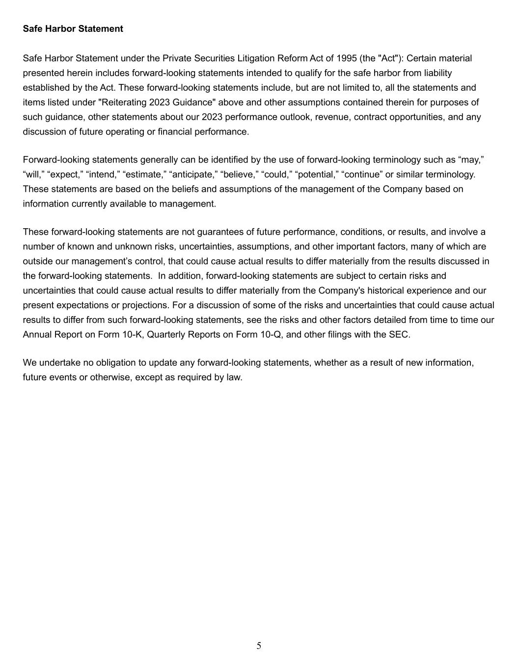5 Safe Harbor Statement Safe Harbor Statement under the Private Securities Litigation Reform Act of 1995 (the "Act"): Certain material presented herein includes forward-looking statements intended to qualify for the safe harbor from liability established by the Act. These forward-looking statements include, but are not limited to, all the statements and items listed under "Reiterating 2023 Guidance" above and other assumptions contained therein for purposes of such guidance, other statements about our 2023 performance outlook, revenue, contract opportunities, and any discussion of future operating or financial performance. Forward-looking statements generally can be identified by the use of forward-looking terminology such as “may,” “will,” “expect,” “intend,” “estimate,” “anticipate,” “believe,” “could,” “potential,” “continue” or similar terminology. These statements are based on the beliefs and assumptions of the management of the Company based on information currently available to management. These forward-looking statements are not guarantees of future performance, conditions, or results, and involve a number of known and unknown risks, uncertainties, assumptions, and other important factors, many of which are outside our management’s control, that could cause actual results to differ materially from the results discussed in the forward-looking statements. In addition, forward-looking statements are subject to certain risks and uncertainties that could cause actual results to differ materially from the Company's historical experience and our present expectations or projections. For a discussion of some of the risks and uncertainties that could cause actual results to differ from such forward-looking statements, see the risks and other factors detailed from time to time our Annual Report on Form 10-K, Quarterly Reports on Form 10-Q, and other filings with the SEC. We undertake no obligation to update any forward-looking statements, whether as a result of new information, future events or otherwise, except as required by law.