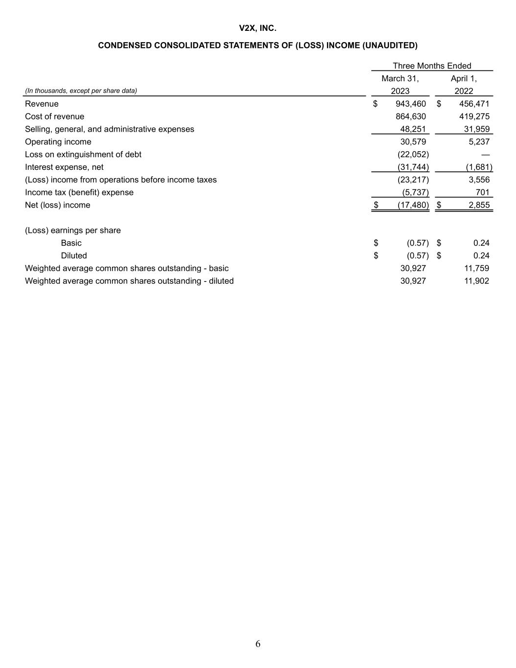 6 V2X, INC. CONDENSED CONSOLIDATED STATEMENTS OF (LOSS) INCOME (UNAUDITED) Three Months Ended March 31, April 1, (In thousands, except per share data) 2023 2022 Revenue $ 943,460 $ 456,471 Cost of revenue 864,630 419,275 Selling, general, and administrative expenses 48,251 31,959 Operating income 30,579 5,237 Loss on extinguishment of debt (22,052) — Interest expense, net (31,744) (1,681) (Loss) income from operations before income taxes (23,217) 3,556 Income tax (benefit) expense (5,737) 701 Net (loss) income $ (17,480) $ 2,855 (Loss) earnings per share Basic $ (0.57) $ 0.24 Diluted $ (0.57) $ 0.24 Weighted average common shares outstanding - basic 30,927 11,759 Weighted average common shares outstanding - diluted 30,927 11,902