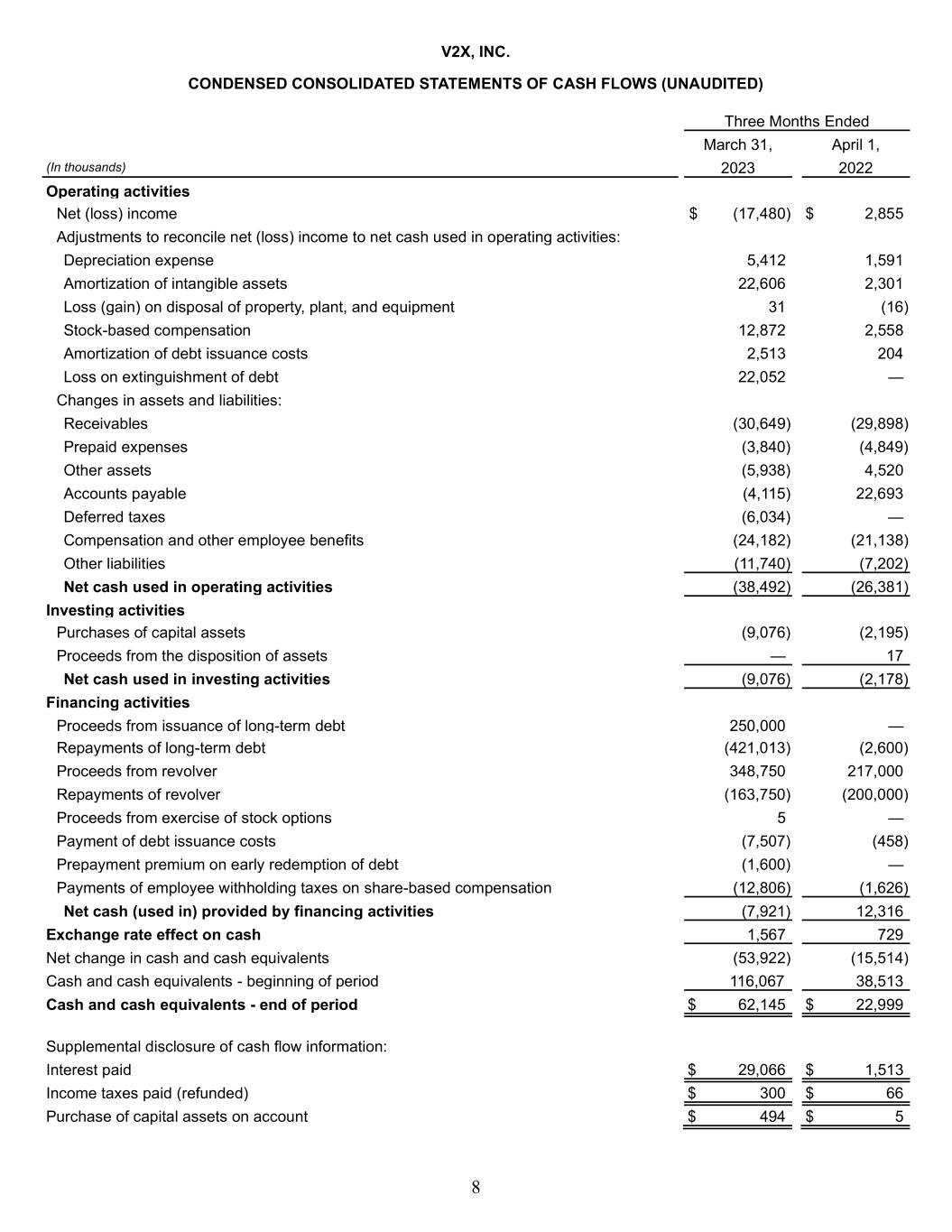 8 V2X, INC. CONDENSED CONSOLIDATED STATEMENTS OF CASH FLOWS (UNAUDITED) Three Months Ended March 31, April 1, (In thousands) 2023 2022 Operating activities Net (loss) income $ (17,480) $ 2,855 Adjustments to reconcile net (loss) income to net cash used in operating activities: Depreciation expense 5,412 1,591 Amortization of intangible assets 22,606 2,301 Loss (gain) on disposal of property, plant, and equipment 31 (16) Stock-based compensation 12,872 2,558 Amortization of debt issuance costs 2,513 204 Loss on extinguishment of debt 22,052 — Changes in assets and liabilities: Receivables (30,649) (29,898) Prepaid expenses (3,840) (4,849) Other assets (5,938) 4,520 Accounts payable (4,115) 22,693 Deferred taxes (6,034) — Compensation and other employee benefits (24,182) (21,138) Other liabilities (11,740) (7,202) Net cash used in operating activities (38,492) (26,381) Investing activities Purchases of capital assets (9,076) (2,195) Proceeds from the disposition of assets — 17 Net cash used in investing activities (9,076) (2,178) Financing activities Proceeds from issuance of long-term debt 250,000 — Repayments of long-term debt (421,013) (2,600) Proceeds from revolver 348,750 217,000 Repayments of revolver (163,750) (200,000) Proceeds from exercise of stock options 5 — Payment of debt issuance costs (7,507) (458) Prepayment premium on early redemption of debt (1,600) — Payments of employee withholding taxes on share-based compensation (12,806) (1,626) Net cash (used in) provided by financing activities (7,921) 12,316 Exchange rate effect on cash 1,567 729 Net change in cash and cash equivalents (53,922) (15,514) Cash and cash equivalents - beginning of period 116,067 38,513 Cash and cash equivalents - end of period $ 62,145 $ 22,999 Supplemental disclosure of cash flow information: Interest paid $ 29,066 $ 1,513 Income taxes paid (refunded) $ 300 $ 66 Purchase of capital assets on account $ 494 $ 5