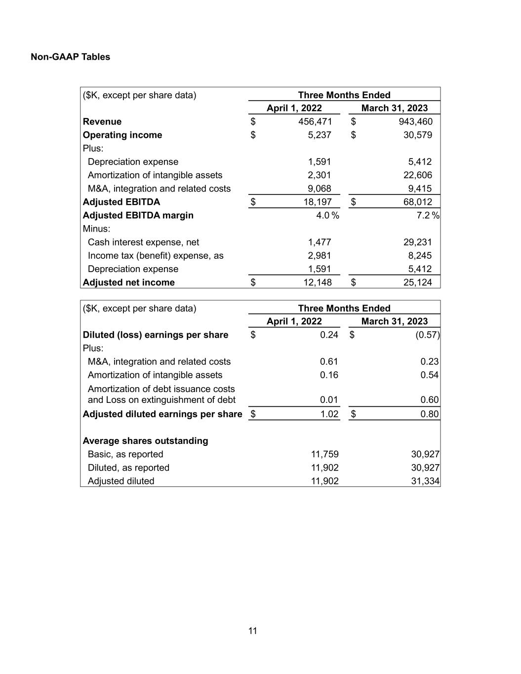 11 Non-GAAP Tables ($K, except per share data) Three Months Ended April 1, 2022 March 31, 2023 Revenue $ 456,471 $ 943,460 Operating income $ 5,237 $ 30,579 Plus: Depreciation expense 1,591 5,412 Amortization of intangible assets 2,301 22,606 M&A, integration and related costs 9,068 9,415 Adjusted EBITDA $ 18,197 $ 68,012 Adjusted EBITDA margin 4.0 % 7.2 % Minus: Cash interest expense, net 1,477 29,231 Income tax (benefit) expense, as adjusted 2,981 8,245 Depreciation expense 1,591 5,412 Adjusted net income $ 12,148 $ 25,124 ($K, except per share data) Three Months Ended April 1, 2022 March 31, 2023 Diluted (loss) earnings per share $ 0.24 $ (0.57) Plus: M&A, integration and related costs 0.61 0.23 Amortization of intangible assets 0.16 0.54 Amortization of debt issuance costs and Loss on extinguishment of debt 0.01 0.60 Adjusted diluted earnings per share $ 1.02 $ 0.80 Average shares outstanding Basic, as reported 11,759 30,927 Diluted, as reported 11,902 30,927 Adjusted diluted 11,902 31,334