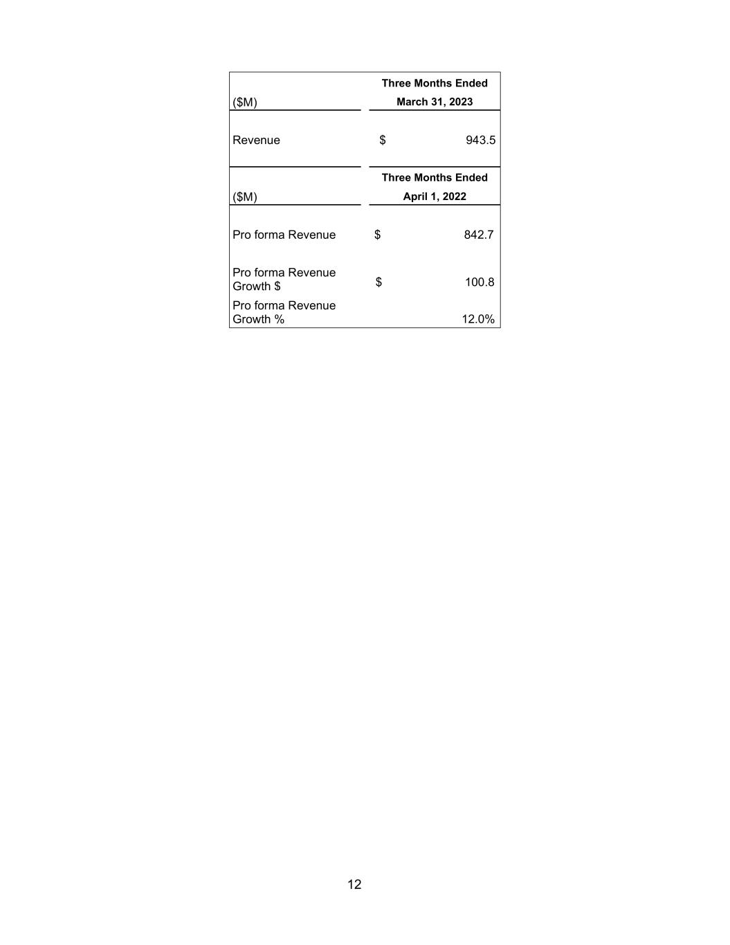 12 Three Months Ended ($M) March 31, 2023 Revenue $ 943.5 Three Months Ended ($M) April 1, 2022 Pro forma Revenue $ 842.7 Pro forma Revenue Growth $ $ 100.8 Pro forma Revenue Growth % 12.0%