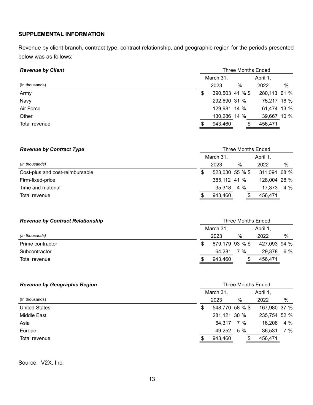 13 SUPPLEMENTAL INFORMATION Revenue by client branch, contract type, contract relationship, and geographic region for the periods presented below was as follows: Revenue by Client Three Months Ended March 31, April 1, (In thousands) 2023 % 2022 % Army $ 390,503 41 % $ 280,113 61 % Navy 292,690 31 % 75,217 16 % Air Force 129,981 14 % 61,474 13 % Other 130,286 14 % 39,667 10 % Total revenue $ 943,460 $ 456,471 Revenue by Contract Type Three Months Ended March 31, April 1, (In thousands) 2023 % 2022 % Cost-plus and cost-reimbursable $ 523,030 55 % $ 311,094 68 % Firm-fixed-price 385,112 41 % 128,004 28 % Time and material 35,318 4 % 17,373 4 % Total revenue $ 943,460 $ 456,471 Revenue by Contract Relationship Three Months Ended March 31, April 1, (In thousands) 2023 % 2022 % Prime contractor $ 879,179 93 % $ 427,093 94 % Subcontractor 64,281 7 % 29,378 6 % Total revenue $ 943,460 $ 456,471 Revenue by Geographic Region Three Months Ended March 31, April 1, (In thousands) 2023 % 2022 % United States $ 548,770 58 % $ 167,980 37 % Middle East 281,121 30 % 235,754 52 % Asia 64,317 7 % 16,206 4 % Europe 49,252 5 % 36,531 7 % Total revenue $ 943,460 $ 456,471 Source: V2X, Inc.
