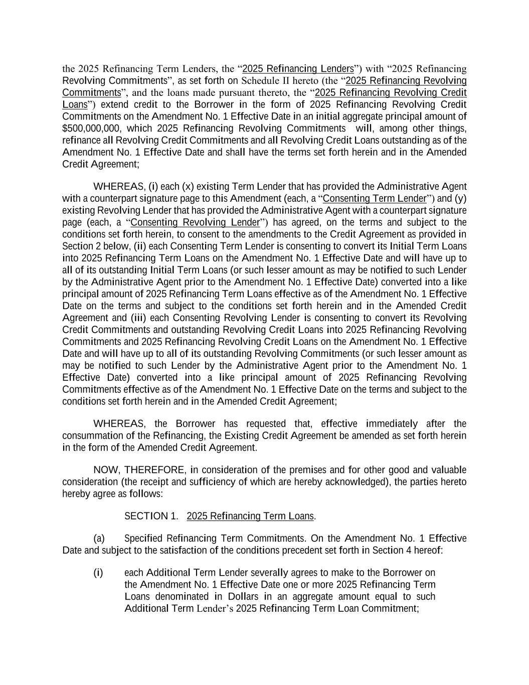 the 2025 Refinancing Term Lenders, the “2025 Refinancing Lenders”) with “2025 Refinancing Revolving Commitments”, as set forth on Schedule II hereto (the “2025 Refinancing Revolving Commitments”, and the loans made pursuant thereto, the “2025 Refinancing Revolving Credit Loans”) extend credit to the Borrower in the form of 2025 Refinancing Revolving Credit Commitments on the Amendment No. 1 Effective Date in an initial aggregate principal amount of $500,000,000, which 2025 Refinancing Revolving Commitments will, among other things, refinance all Revolving Credit Commitments and all Revolving Credit Loans outstanding as of the Amendment No. 1 Effective Date and shall have the terms set forth herein and in the Amended Credit Agreement; WHEREAS, (i) each (x) existing Term Lender that has provided the Administrative Agent with a counterpart signature page to this Amendment (each, a “Consenting Term Lender”) and (y) existing Revolving Lender that has provided the Administrative Agent with a counterpart signature page (each, a “Consenting Revolving Lender”) has agreed, on the terms and subject to the conditions set forth herein, to consent to the amendments to the Credit Agreement as provided in Section 2 below, (ii) each Consenting Term Lender is consenting to convert its Initial Term Loans into 2025 Refinancing Term Loans on the Amendment No. 1 Effective Date and will have up to all of its outstanding Initial Term Loans (or such lesser amount as may be notified to such Lender by the Administrative Agent prior to the Amendment No. 1 Effective Date) converted into a like principal amount of 2025 Refinancing Term Loans effective as of the Amendment No. 1 Effective Date on the terms and subject to the conditions set forth herein and in the Amended Credit Agreement and (iii) each Consenting Revolving Lender is consenting to convert its Revolving Credit Commitments and outstanding Revolving Credit Loans into 2025 Refinancing Revolving Commitments and 2025 Refinancing Revolving Credit Loans on the Amendment No. 1 Effective Date and will have up to all of its outstanding Revolving Commitments (or such lesser amount as may be notified to such Lender by the Administrative Agent prior to the Amendment No. 1 Effective Date) converted into a like principal amount of 2025 Refinancing Revolving Commitments effective as of the Amendment No. 1 Effective Date on the terms and subject to the conditions set forth herein and in the Amended Credit Agreement; WHEREAS, the Borrower has requested that, effective immediately after the consummation of the Refinancing, the Existing Credit Agreement be amended as set forth herein in the form of the Amended Credit Agreement. NOW, THEREFORE, in consideration of the premises and for other good and valuable consideration (the receipt and sufficiency of which are hereby acknowledged), the parties hereto hereby agree as follows: SECTION 1. 2025 Refinancing Term Loans. (a) Specified Refinancing Term Commitments. On the Amendment No. 1 Effective Date and subject to the satisfaction of the conditions precedent set forth in Section 4 hereof: (i) each Additional Term Lender severally agrees to make to the Borrower on the Amendment No. 1 Effective Date one or more 2025 Refinancing Term Loans denominated in Dollars in an aggregate amount equal to such Additional Term Lender’s 2025 Refinancing Term Loan Commitment;