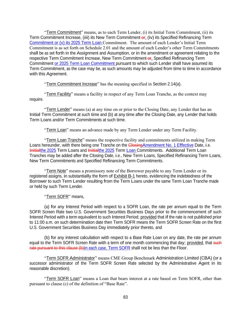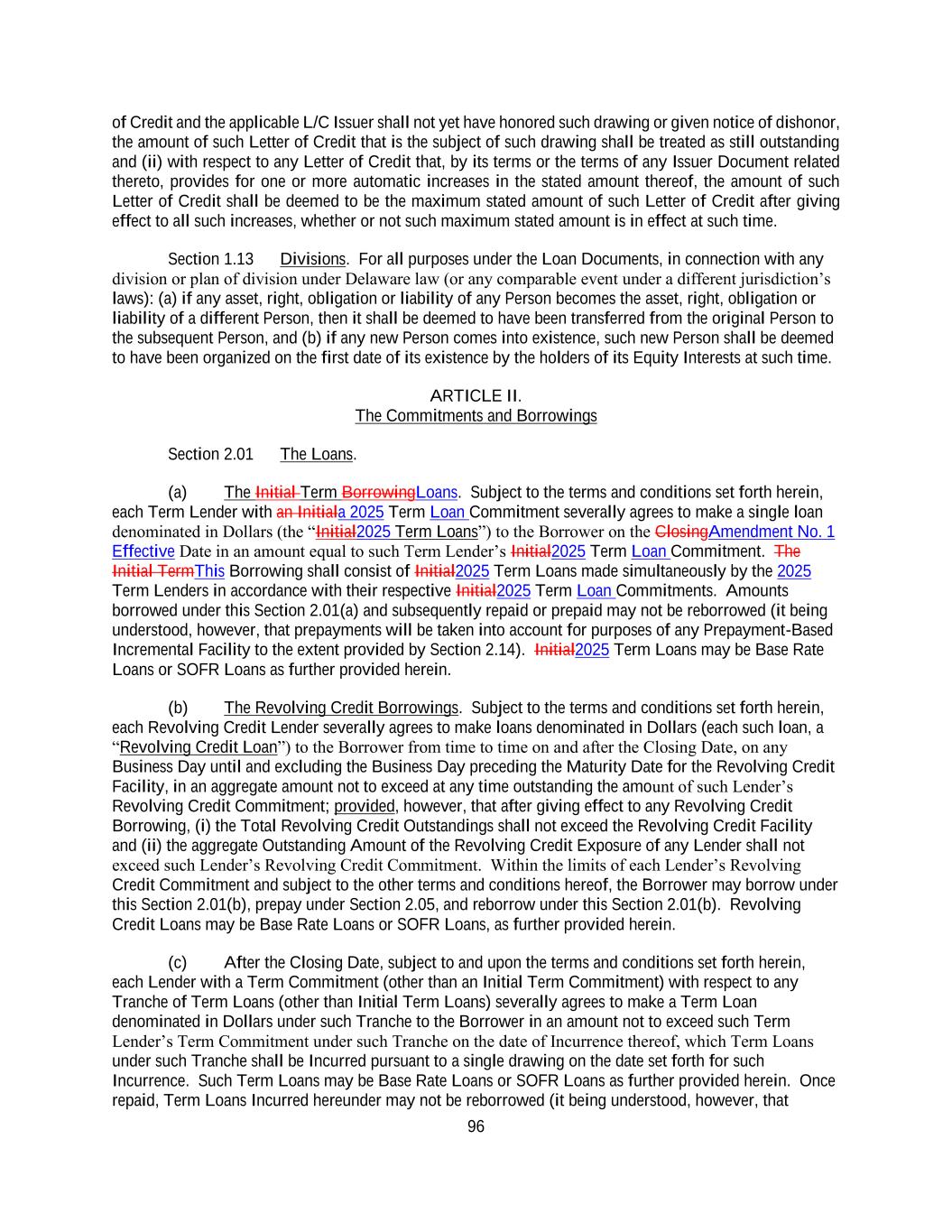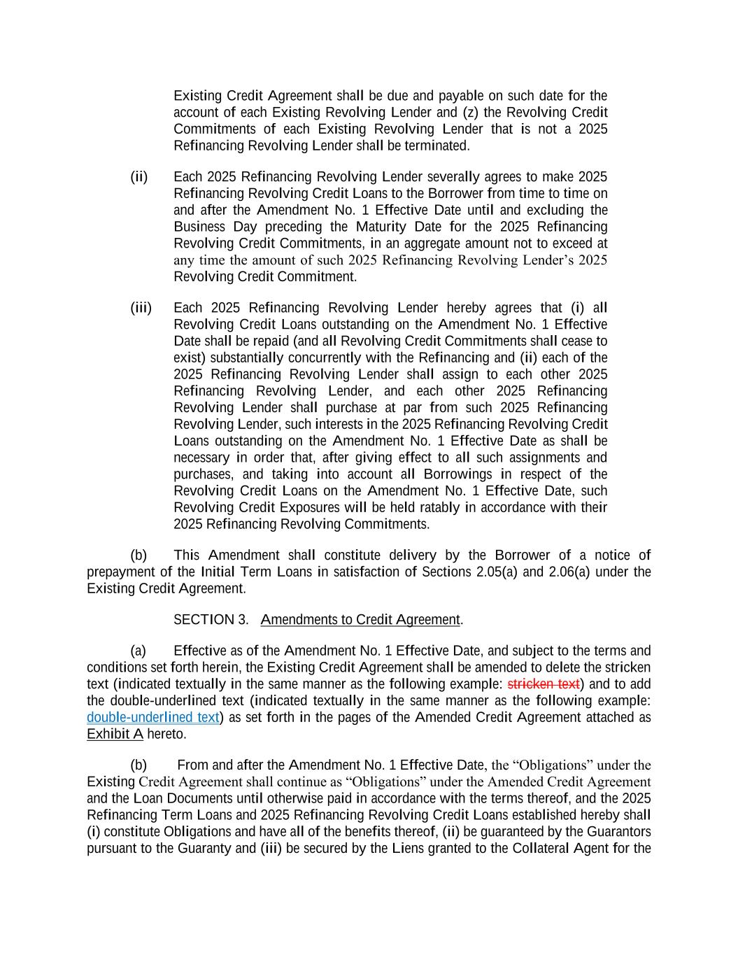 Existing Credit Agreement shall be due and payable on such date for the account of each Existing Revolving Lender and (z) the Revolving Credit Commitments of each Existing Revolving Lender that is not a 2025 Refinancing Revolving Lender shall be terminated. (ii) Each 2025 Refinancing Revolving Lender severally agrees to make 2025 Refinancing Revolving Credit Loans to the Borrower from time to time on and after the Amendment No. 1 Effective Date until and excluding the Business Day preceding the Maturity Date for the 2025 Refinancing Revolving Credit Commitments, in an aggregate amount not to exceed at any time the amount of such 2025 Refinancing Revolving Lender’s 2025 Revolving Credit Commitment. (iii) Each 2025 Refinancing Revolving Lender hereby agrees that (i) all Revolving Credit Loans outstanding on the Amendment No. 1 Effective Date shall be repaid (and all Revolving Credit Commitments shall cease to exist) substantially concurrently with the Refinancing and (ii) each of the 2025 Refinancing Revolving Lender shall assign to each other 2025 Refinancing Revolving Lender, and each other 2025 Refinancing Revolving Lender shall purchase at par from such 2025 Refinancing Revolving Lender, such interests in the 2025 Refinancing Revolving Credit Loans outstanding on the Amendment No. 1 Effective Date as shall be necessary in order that, after giving effect to all such assignments and purchases, and taking into account all Borrowings in respect of the Revolving Credit Loans on the Amendment No. 1 Effective Date, such Revolving Credit Exposures will be held ratably in accordance with their 2025 Refinancing Revolving Commitments. (b) This Amendment shall constitute delivery by the Borrower of a notice of prepayment of the Initial Term Loans in satisfaction of Sections 2.05(a) and 2.06(a) under the Existing Credit Agreement. SECTION 3. Amendments to Credit Agreement. (a) Effective as of the Amendment No. 1 Effective Date, and subject to the terms and conditions set forth herein, the Existing Credit Agreement shall be amended to delete the stricken text (indicated textually in the same manner as the following example: stricken text) and to add the double-underlined text (indicated textually in the same manner as the following example: double-underlined text) as set forth in the pages of the Amended Credit Agreement attached as Exhibit A hereto. (b) From and after the Amendment No. 1 Effective Date, the “Obligations” under the Existing Credit Agreement shall continue as “Obligations” under the Amended Credit Agreement and the Loan Documents until otherwise paid in accordance with the terms thereof, and the 2025 Refinancing Term Loans and 2025 Refinancing Revolving Credit Loans established hereby shall (i) constitute Obligations and have all of the benefits thereof, (ii) be guaranteed by the Guarantors pursuant to the Guaranty and (iii) be secured by the Liens granted to the Collateral Agent for the