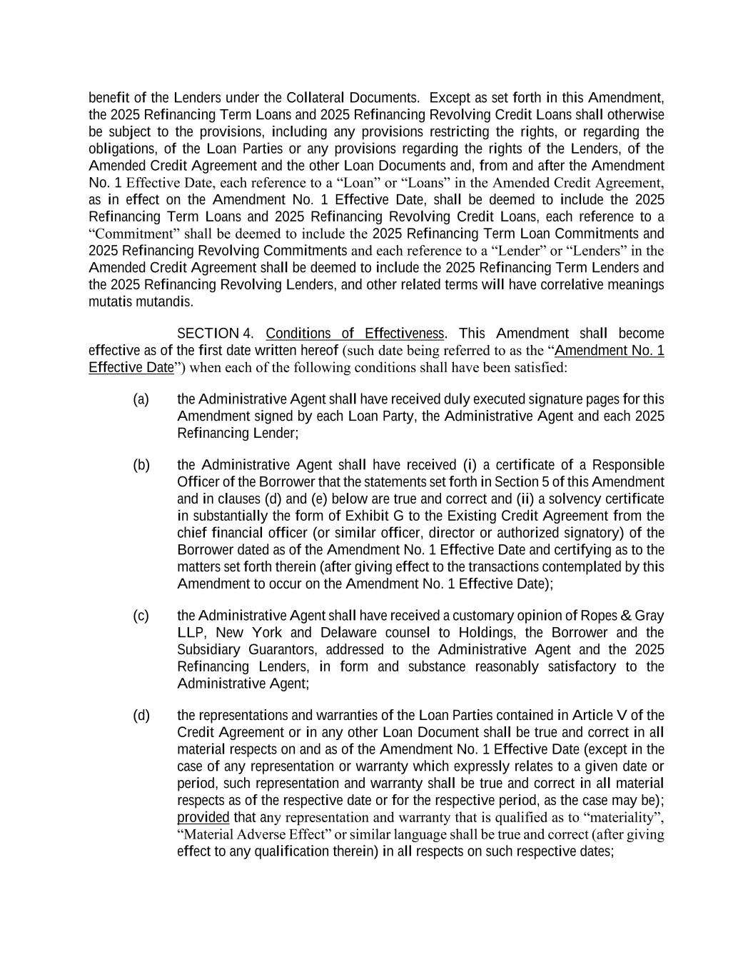 benefit of the Lenders under the Collateral Documents. Except as set forth in this Amendment, the 2025 Refinancing Term Loans and 2025 Refinancing Revolving Credit Loans shall otherwise be subject to the provisions, including any provisions restricting the rights, or regarding the obligations, of the Loan Parties or any provisions regarding the rights of the Lenders, of the Amended Credit Agreement and the other Loan Documents and, from and after the Amendment No. 1 Effective Date, each reference to a “Loan” or “Loans” in the Amended Credit Agreement, as in effect on the Amendment No. 1 Effective Date, shall be deemed to include the 2025 Refinancing Term Loans and 2025 Refinancing Revolving Credit Loans, each reference to a “Commitment” shall be deemed to include the 2025 Refinancing Term Loan Commitments and 2025 Refinancing Revolving Commitments and each reference to a “Lender” or “Lenders” in the Amended Credit Agreement shall be deemed to include the 2025 Refinancing Term Lenders and the 2025 Refinancing Revolving Lenders, and other related terms will have correlative meanings mutatis mutandis. SECTION 4. Conditions of Effectiveness. This Amendment shall become effective as of the first date written hereof (such date being referred to as the “Amendment No. 1 Effective Date”) when each of the following conditions shall have been satisfied: (a) the Administrative Agent shall have received duly executed signature pages for this Amendment signed by each Loan Party, the Administrative Agent and each 2025 Refinancing Lender; (b) the Administrative Agent shall have received (i) a certificate of a Responsible Officer of the Borrower that the statements set forth in Section 5 of this Amendment and in clauses (d) and (e) below are true and correct and (ii) a solvency certificate in substantially the form of Exhibit G to the Existing Credit Agreement from the chief financial officer (or similar officer, director or authorized signatory) of the Borrower dated as of the Amendment No. 1 Effective Date and certifying as to the matters set forth therein (after giving effect to the transactions contemplated by this Amendment to occur on the Amendment No. 1 Effective Date); (c) the Administrative Agent shall have received a customary opinion of Ropes & Gray LLP, New York and Delaware counsel to Holdings, the Borrower and the Subsidiary Guarantors, addressed to the Administrative Agent and the 2025 Refinancing Lenders, in form and substance reasonably satisfactory to the Administrative Agent; (d) the representations and warranties of the Loan Parties contained in Article V of the Credit Agreement or in any other Loan Document shall be true and correct in all material respects on and as of the Amendment No. 1 Effective Date (except in the case of any representation or warranty which expressly relates to a given date or period, such representation and warranty shall be true and correct in all material respects as of the respective date or for the respective period, as the case may be); provided that any representation and warranty that is qualified as to “materiality”, “Material Adverse Effect” or similar language shall be true and correct (after giving effect to any qualification therein) in all respects on such respective dates;