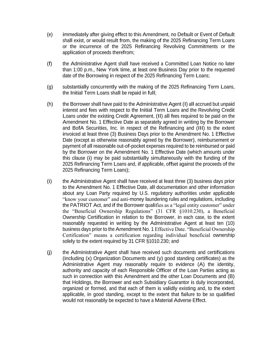 (e) immediately after giving effect to this Amendment, no Default or Event of Default shall exist, or would result from, the making of the 2025 Refinancing Term Loans or the incurrence of the 2025 Refinancing Revolving Commitments or the application of proceeds therefrom; (f) the Administrative Agent shall have received a Committed Loan Notice no later than 1:00 p.m., New York time, at least one Business Day prior to the requested date of the Borrowing in respect of the 2025 Refinancing Term Loans; (g) substantially concurrently with the making of the 2025 Refinancing Term Loans, the Initial Term Loans shall be repaid in full; (h) the Borrower shall have paid to the Administrative Agent (I) all accrued but unpaid interest and fees with respect to the Initial Term Loans and the Revolving Credit Loans under the existing Credit Agreement, (II) all fees required to be paid on the Amendment No. 1 Effective Date as separately agreed in writing by the Borrower and BofA Securities, Inc. in respect of the Refinancing and (III) to the extent invoiced at least three (3) Business Days prior to the Amendment No. 1 Effective Date (except as otherwise reasonably agreed by the Borrower), reimbursement or payment of all reasonable out-of-pocket expenses required to be reimbursed or paid by the Borrower on the Amendment No. 1 Effective Date (which amounts under this clause (i) may be paid substantially simultaneously with the funding of the 2025 Refinancing Term Loans and, if applicable, offset against the proceeds of the 2025 Refinancing Term Loans); (i) the Administrative Agent shall have received at least three (3) business days prior to the Amendment No. 1 Effective Date, all documentation and other information about any Loan Party required by U.S. regulatory authorities under applicable “know your customer” and anti-money laundering rules and regulations, including the PATRIOT Act, and if the Borrower qualifies as a “legal entity customer” under the “Beneficial Ownership Regulations” (31 CFR §1010.230), a Beneficial Ownership Certification in relation to the Borrower, in each case, to the extent reasonably requested in writing by the Administrative Agent at least ten (10) business days prior to the Amendment No. 1 Effective Date. “Beneficial Ownership Certification” means a certification regarding individual beneficial ownership solely to the extent required by 31 CFR §1010.230; and (j) the Administrative Agent shall have received such documents and certifications (including (x) Organization Documents and (y) good standing certificates) as the Administrative Agent may reasonably require to evidence (A) the identity, authority and capacity of each Responsible Officer of the Loan Parties acting as such in connection with this Amendment and the other Loan Documents and (B) that Holdings, the Borrower and each Subsidiary Guarantor is duly incorporated, organized or formed, and that each of them is validly existing and, to the extent applicable, in good standing, except to the extent that failure to be so qualified would not reasonably be expected to have a Material Adverse Effect.