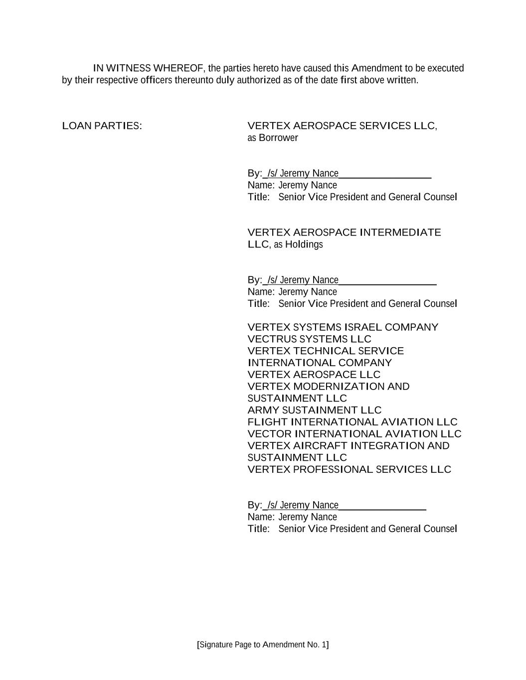[Signature Page to Amendment No. 1] IN WITNESS WHEREOF, the parties hereto have caused this Amendment to be executed by their respective officers thereunto duly authorized as of the date first above written. LOAN PARTIES: VERTEX AEROSPACE SERVICES LLC, as Borrower By:_/s/ Jeremy Nance__________________ Name: Jeremy Nance Title: Senior Vice President and General Counsel VERTEX AEROSPACE INTERMEDIATE LLC, as Holdings By:_/s/ Jeremy Nance___________________ Name: Jeremy Nance Title: Senior Vice President and General Counsel VERTEX SYSTEMS ISRAEL COMPANY VECTRUS SYSTEMS LLC VERTEX TECHNICAL SERVICE INTERNATIONAL COMPANY VERTEX AEROSPACE LLC VERTEX MODERNIZATION AND SUSTAINMENT LLC ARMY SUSTAINMENT LLC FLIGHT INTERNATIONAL AVIATION LLC VECTOR INTERNATIONAL AVIATION LLC VERTEX AIRCRAFT INTEGRATION AND SUSTAINMENT LLC VERTEX PROFESSIONAL SERVICES LLC By:_/s/ Jeremy Nance_________________ Name: Jeremy Nance Title: Senior Vice President and General Counsel