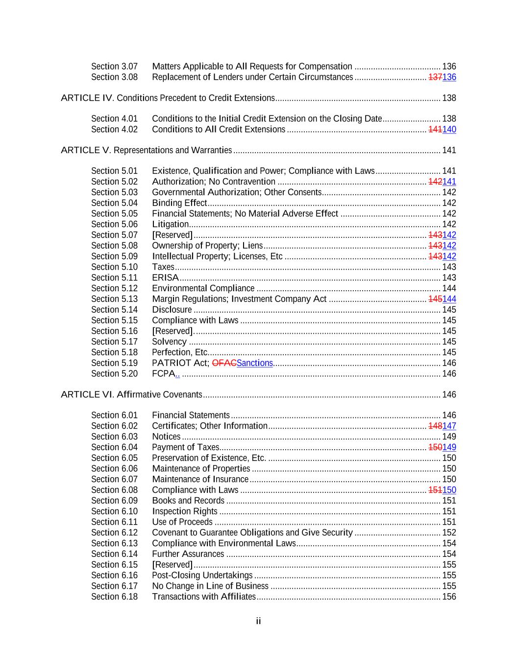ii Section 3.07 Matters Applicable to All Requests for Compensation ..................................... 136 Section 3.08 Replacement of Lenders under Certain Circumstances ............................... 137136 ARTICLE IV. Conditions Precedent to Credit Extensions ....................................................................... 138 Section 4.01 Conditions to the Initial Credit Extension on the Closing Date ......................... 138 Section 4.02 Conditions to All Credit Extensions ............................................................ 141140 ARTICLE V. Representations and Warranties ......................................................................................... 141 Section 5.01 Existence, Qualification and Power; Compliance with Laws ............................ 141 Section 5.02 Authorization; No Contravention ................................................................ 142141 Section 5.03 Governmental Authorization; Other Consents ................................................... 142 Section 5.04 Binding Effect .................................................................................................... 142 Section 5.05 Financial Statements; No Material Adverse Effect ........................................... 142 Section 5.06 Litigation ............................................................................................................ 142 Section 5.07 [Reserved] .................................................................................................... 143142 Section 5.08 Ownership of Property; Liens ...................................................................... 143142 Section 5.09 Intellectual Property; Licenses, Etc ............................................................. 143142 Section 5.10 Taxes .................................................................................................................. 143 Section 5.11 ERISA ................................................................................................................ 143 Section 5.12 Environmental Compliance ............................................................................... 144 Section 5.13 Margin Regulations; Investment Company Act .......................................... 145144 Section 5.14 Disclosure .......................................................................................................... 145 Section 5.15 Compliance with Laws ...................................................................................... 145 Section 5.16 [Reserved]. ......................................................................................................... 145 Section 5.17 Solvency ............................................................................................................ 145 Section 5.18 Perfection, Etc. ................................................................................................... 145 Section 5.19 PATRIOT Act; OFACSanctions........................................................................ 146 Section 5.20 FCPA.. ............................................................................................................... 146 ARTICLE VI. Affirmative Covenants ...................................................................................................... 146 Section 6.01 Financial Statements .......................................................................................... 146 Section 6.02 Certificates; Other Information .................................................................... 148147 Section 6.03 Notices ............................................................................................................... 149 Section 6.04 Payment of Taxes......................................................................................... 150149 Section 6.05 Preservation of Existence, Etc. .......................................................................... 150 Section 6.06 Maintenance of Properties ................................................................................. 150 Section 6.07 Maintenance of Insurance .................................................................................. 150 Section 6.08 Compliance with Laws ................................................................................ 151150 Section 6.09 Books and Records ............................................................................................ 151 Section 6.10 Inspection Rights ............................................................................................... 151 Section 6.11 Use of Proceeds ................................................................................................. 151 Section 6.12 Covenant to Guarantee Obligations and Give Security ..................................... 152 Section 6.13 Compliance with Environmental Laws .............................................................. 154 Section 6.14 Further Assurances ............................................................................................ 154 Section 6.15 [Reserved] .......................................................................................................... 155 Section 6.16 Post-Closing Undertakings ................................................................................ 155 Section 6.17 No Change in Line of Business ......................................................................... 155 Section 6.18 Transactions with Affiliates ............................................................................... 156
