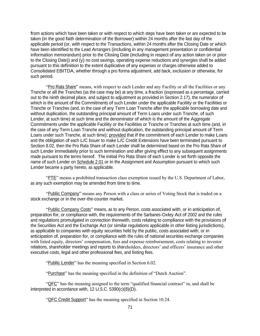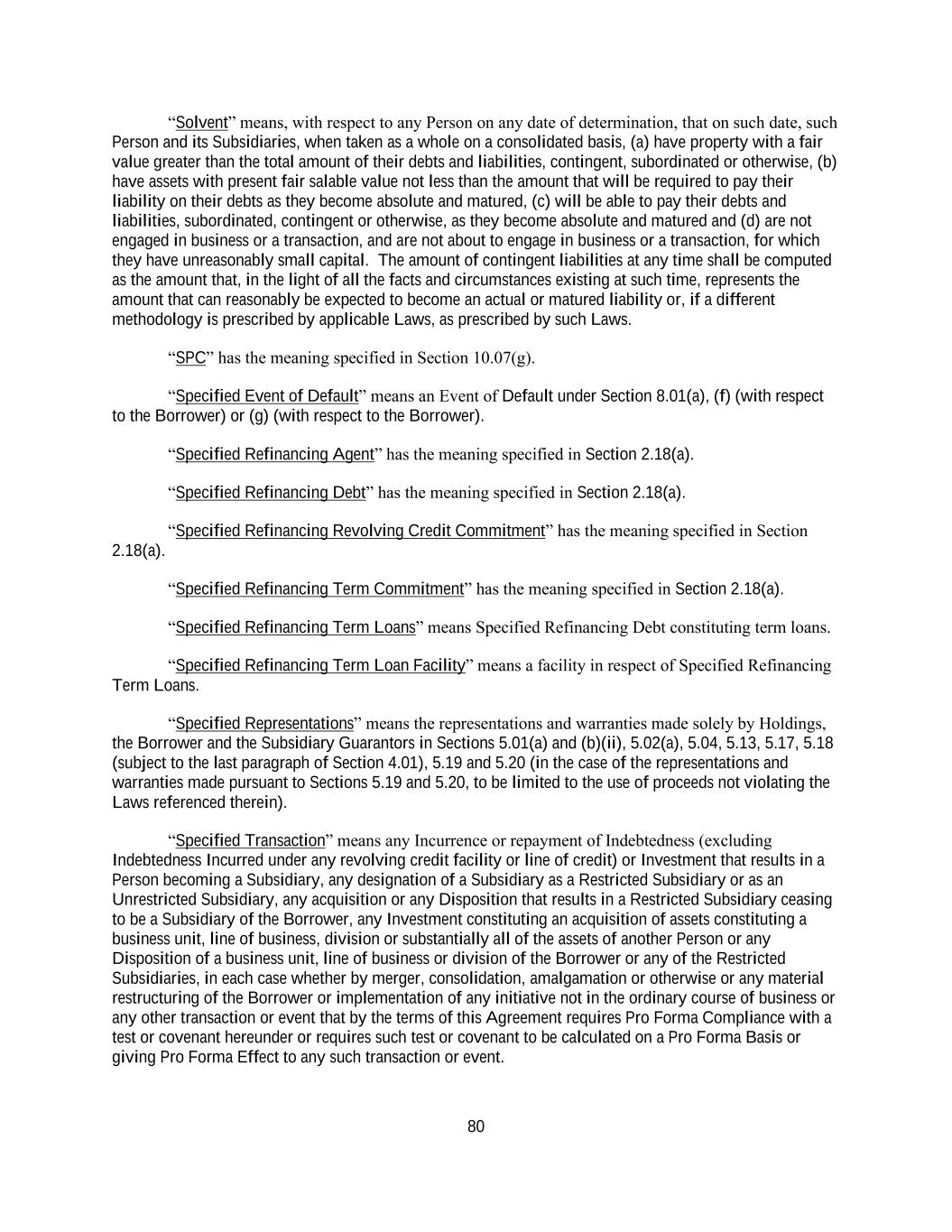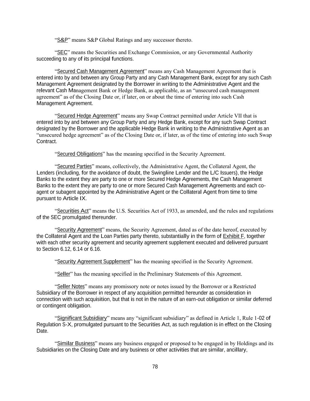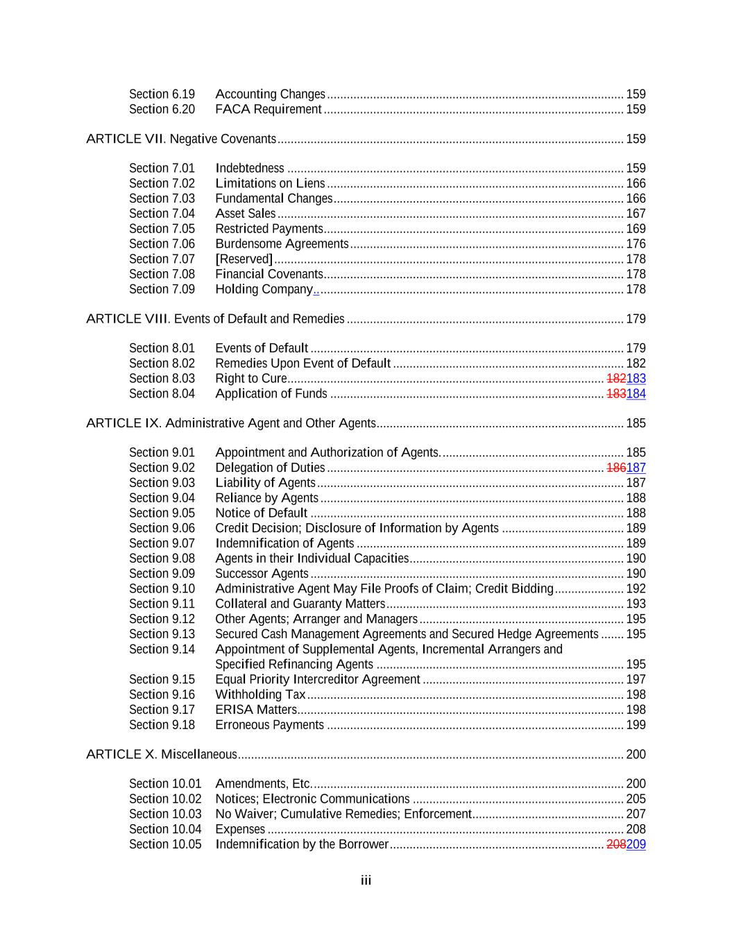 iii Section 6.19 Accounting Changes .......................................................................................... 159 Section 6.20 FACA Requirement ........................................................................................... 159 ARTICLE VII. Negative Covenants ......................................................................................................... 159 Section 7.01 Indebtedness ...................................................................................................... 159 Section 7.02 Limitations on Liens .......................................................................................... 166 Section 7.03 Fundamental Changes ........................................................................................ 166 Section 7.04 Asset Sales ......................................................................................................... 167 Section 7.05 Restricted Payments ........................................................................................... 169 Section 7.06 Burdensome Agreements ................................................................................... 176 Section 7.07 [Reserved] .......................................................................................................... 178 Section 7.08 Financial Covenants ........................................................................................... 178 Section 7.09 Holding Company.. ............................................................................................ 178 ARTICLE VIII. Events of Default and Remedies .................................................................................... 179 Section 8.01 Events of Default ............................................................................................... 179 Section 8.02 Remedies Upon Event of Default ...................................................................... 182 Section 8.03 Right to Cure ................................................................................................ 182183 Section 8.04 Application of Funds ................................................................................... 183184 ARTICLE IX. Administrative Agent and Other Agents ........................................................................... 185 Section 9.01 Appointment and Authorization of Agents. ....................................................... 185 Section 9.02 Delegation of Duties .................................................................................... 186187 Section 9.03 Liability of Agents ............................................................................................. 187 Section 9.04 Reliance by Agents ............................................................................................ 188 Section 9.05 Notice of Default ............................................................................................... 188 Section 9.06 Credit Decision; Disclosure of Information by Agents ..................................... 189 Section 9.07 Indemnification of Agents ................................................................................. 189 Section 9.08 Agents in their Individual Capacities ................................................................. 190 Section 9.09 Successor Agents ............................................................................................... 190 Section 9.10 Administrative Agent May File Proofs of Claim; Credit Bidding ..................... 192 Section 9.11 Collateral and Guaranty Matters ........................................................................ 193 Section 9.12 Other Agents; Arranger and Managers .............................................................. 195 Section 9.13 Secured Cash Management Agreements and Secured Hedge Agreements ....... 195 Section 9.14 Appointment of Supplemental Agents, Incremental Arrangers and Specified Refinancing Agents ........................................................................... 195 Section 9.15 Equal Priority Intercreditor Agreement ............................................................. 197 Section 9.16 Withholding Tax ................................................................................................ 198 Section 9.17 ERISA Matters ................................................................................................... 198 Section 9.18 Erroneous Payments .......................................................................................... 199 ARTICLE X. Miscellaneous ..................................................................................................................... 200 Section 10.01 Amendments, Etc. .............................................................................................. 200 Section 10.02 Notices; Electronic Communications ................................................................ 205 Section 10.03 No Waiver; Cumulative Remedies; Enforcement .............................................. 207 Section 10.04 Expenses ............................................................................................................ 208 Section 10.05 Indemnification by the Borrower ................................................................. 208209