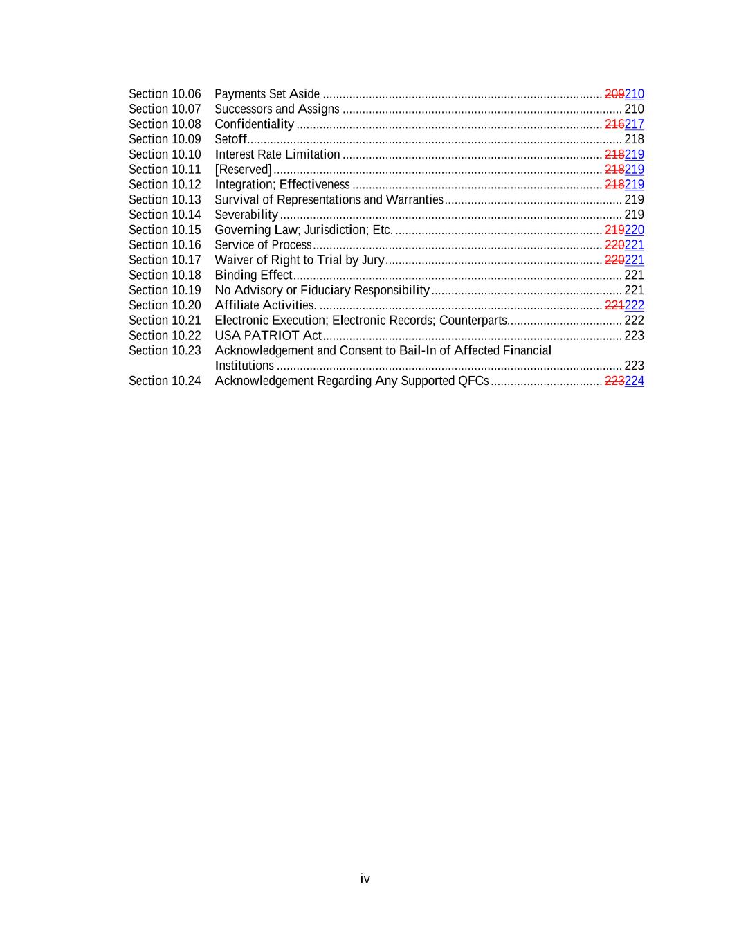 iv Section 10.06 Payments Set Aside ..................................................................................... 209210 Section 10.07 Successors and Assigns ..................................................................................... 210 Section 10.08 Confidentiality ............................................................................................. 216217 Section 10.09 Setoff .................................................................................................................. 218 Section 10.10 Interest Rate Limitation ............................................................................... 218219 Section 10.11 [Reserved] .................................................................................................... 218219 Section 10.12 Integration; Effectiveness ............................................................................ 218219 Section 10.13 Survival of Representations and Warranties ...................................................... 219 Section 10.14 Severability ........................................................................................................ 219 Section 10.15 Governing Law; Jurisdiction; Etc. ............................................................... 219220 Section 10.16 Service of Process ........................................................................................ 220221 Section 10.17 Waiver of Right to Trial by Jury .................................................................. 220221 Section 10.18 Binding Effect .................................................................................................... 221 Section 10.19 No Advisory or Fiduciary Responsibility .......................................................... 221 Section 10.20 Affiliate Activities. ...................................................................................... 221222 Section 10.21 Electronic Execution; Electronic Records; Counterparts................................... 222 Section 10.22 USA PATRIOT Act ........................................................................................... 223 Section 10.23 Acknowledgement and Consent to Bail-In of Affected Financial Institutions ......................................................................................................... 223 Section 10.24 Acknowledgement Regarding Any Supported QFCs .................................. 223224