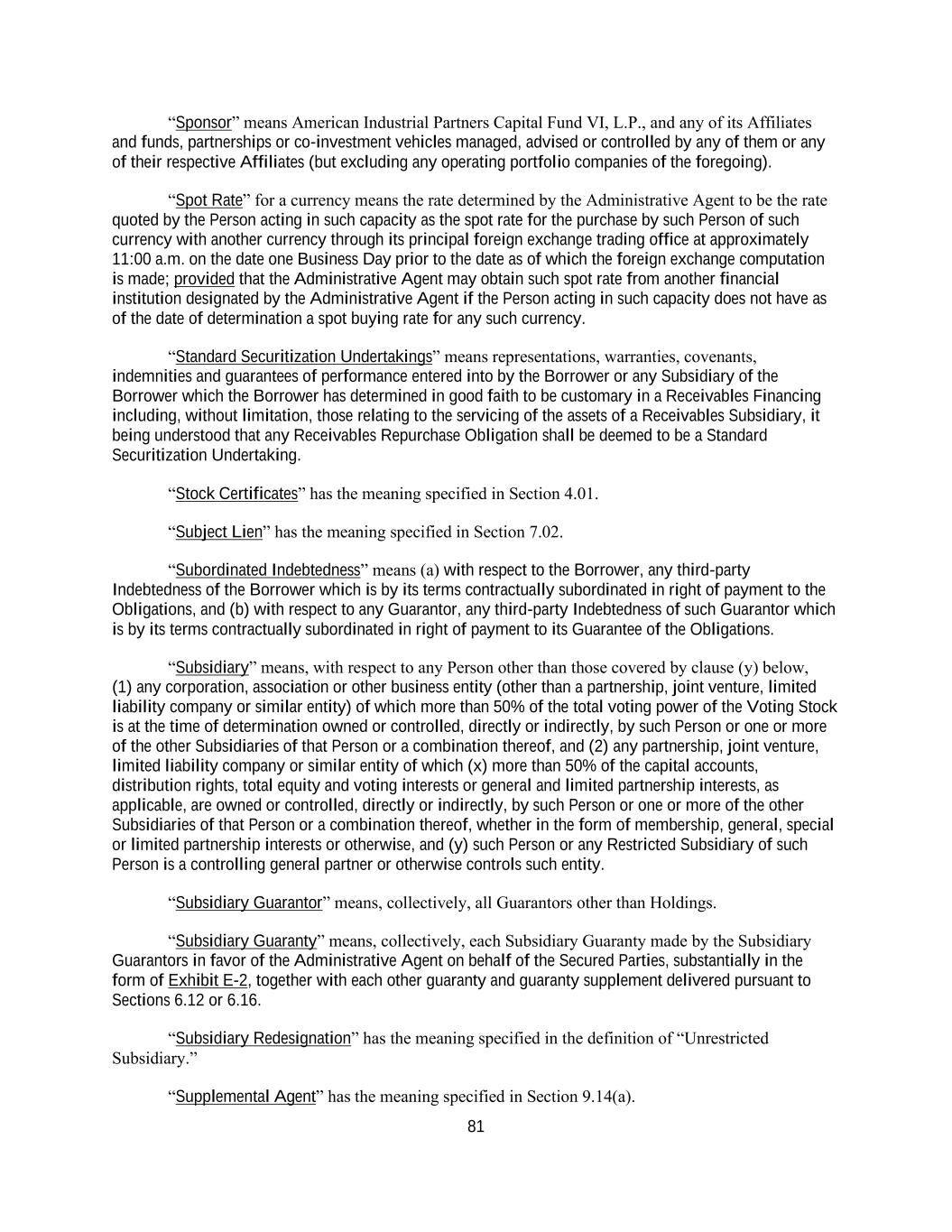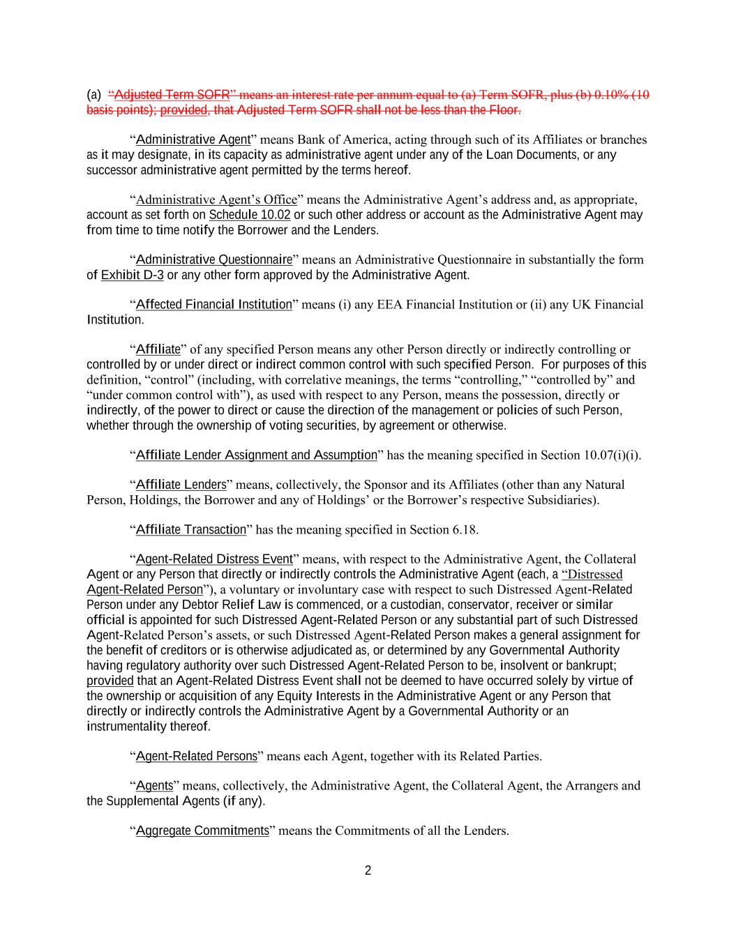 2 (a) “Adjusted Term SOFR” means an interest rate per annum equal to (a) Term SOFR, plus (b) 0.10% (10 basis points); provided, that Adjusted Term SOFR shall not be less than the Floor. “Administrative Agent” means Bank of America, acting through such of its Affiliates or branches as it may designate, in its capacity as administrative agent under any of the Loan Documents, or any successor administrative agent permitted by the terms hereof. “Administrative Agent’s Office” means the Administrative Agent’s address and, as appropriate, account as set forth on Schedule 10.02 or such other address or account as the Administrative Agent may from time to time notify the Borrower and the Lenders. “Administrative Questionnaire” means an Administrative Questionnaire in substantially the form of Exhibit D-3 or any other form approved by the Administrative Agent. “Affected Financial Institution” means (i) any EEA Financial Institution or (ii) any UK Financial Institution. “Affiliate” of any specified Person means any other Person directly or indirectly controlling or controlled by or under direct or indirect common control with such specified Person. For purposes of this definition, “control” (including, with correlative meanings, the terms “controlling,” “controlled by” and “under common control with”), as used with respect to any Person, means the possession, directly or indirectly, of the power to direct or cause the direction of the management or policies of such Person, whether through the ownership of voting securities, by agreement or otherwise. “Affiliate Lender Assignment and Assumption” has the meaning specified in Section 10.07(i)(i). “Affiliate Lenders” means, collectively, the Sponsor and its Affiliates (other than any Natural Person, Holdings, the Borrower and any of Holdings’ or the Borrower’s respective Subsidiaries). “Affiliate Transaction” has the meaning specified in Section 6.18. “Agent-Related Distress Event” means, with respect to the Administrative Agent, the Collateral Agent or any Person that directly or indirectly controls the Administrative Agent (each, a “Distressed Agent-Related Person”), a voluntary or involuntary case with respect to such Distressed Agent-Related Person under any Debtor Relief Law is commenced, or a custodian, conservator, receiver or similar official is appointed for such Distressed Agent-Related Person or any substantial part of such Distressed Agent-Related Person’s assets, or such Distressed Agent-Related Person makes a general assignment for the benefit of creditors or is otherwise adjudicated as, or determined by any Governmental Authority having regulatory authority over such Distressed Agent-Related Person to be, insolvent or bankrupt; provided that an Agent-Related Distress Event shall not be deemed to have occurred solely by virtue of the ownership or acquisition of any Equity Interests in the Administrative Agent or any Person that directly or indirectly controls the Administrative Agent by a Governmental Authority or an instrumentality thereof. “Agent-Related Persons” means each Agent, together with its Related Parties. “Agents” means, collectively, the Administrative Agent, the Collateral Agent, the Arrangers and the Supplemental Agents (if any). “Aggregate Commitments” means the Commitments of all the Lenders.
