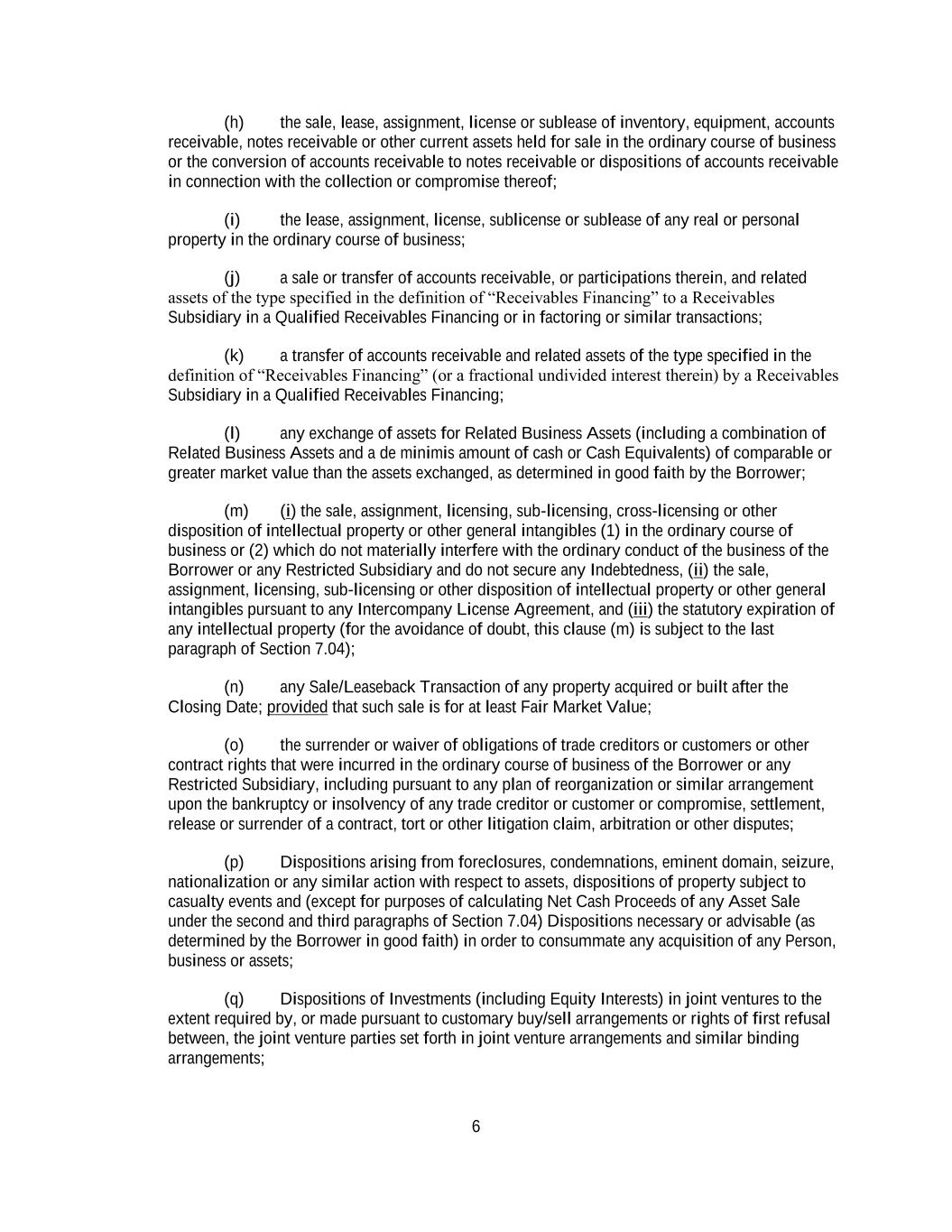 6 (h) the sale, lease, assignment, license or sublease of inventory, equipment, accounts receivable, notes receivable or other current assets held for sale in the ordinary course of business or the conversion of accounts receivable to notes receivable or dispositions of accounts receivable in connection with the collection or compromise thereof; (i) the lease, assignment, license, sublicense or sublease of any real or personal property in the ordinary course of business; (j) a sale or transfer of accounts receivable, or participations therein, and related assets of the type specified in the definition of “Receivables Financing” to a Receivables Subsidiary in a Qualified Receivables Financing or in factoring or similar transactions; (k) a transfer of accounts receivable and related assets of the type specified in the definition of “Receivables Financing” (or a fractional undivided interest therein) by a Receivables Subsidiary in a Qualified Receivables Financing; (l) any exchange of assets for Related Business Assets (including a combination of Related Business Assets and a de minimis amount of cash or Cash Equivalents) of comparable or greater market value than the assets exchanged, as determined in good faith by the Borrower; (m) (i) the sale, assignment, licensing, sub-licensing, cross-licensing or other disposition of intellectual property or other general intangibles (1) in the ordinary course of business or (2) which do not materially interfere with the ordinary conduct of the business of the Borrower or any Restricted Subsidiary and do not secure any Indebtedness, (ii) the sale, assignment, licensing, sub-licensing or other disposition of intellectual property or other general intangibles pursuant to any Intercompany License Agreement, and (iii) the statutory expiration of any intellectual property (for the avoidance of doubt, this clause (m) is subject to the last paragraph of Section 7.04); (n) any Sale/Leaseback Transaction of any property acquired or built after the Closing Date; provided that such sale is for at least Fair Market Value; (o) the surrender or waiver of obligations of trade creditors or customers or other contract rights that were incurred in the ordinary course of business of the Borrower or any Restricted Subsidiary, including pursuant to any plan of reorganization or similar arrangement upon the bankruptcy or insolvency of any trade creditor or customer or compromise, settlement, release or surrender of a contract, tort or other litigation claim, arbitration or other disputes; (p) Dispositions arising from foreclosures, condemnations, eminent domain, seizure, nationalization or any similar action with respect to assets, dispositions of property subject to casualty events and (except for purposes of calculating Net Cash Proceeds of any Asset Sale under the second and third paragraphs of Section 7.04) Dispositions necessary or advisable (as determined by the Borrower in good faith) in order to consummate any acquisition of any Person, business or assets; (q) Dispositions of Investments (including Equity Interests) in joint ventures to the extent required by, or made pursuant to customary buy/sell arrangements or rights of first refusal between, the joint venture parties set forth in joint venture arrangements and similar binding arrangements;